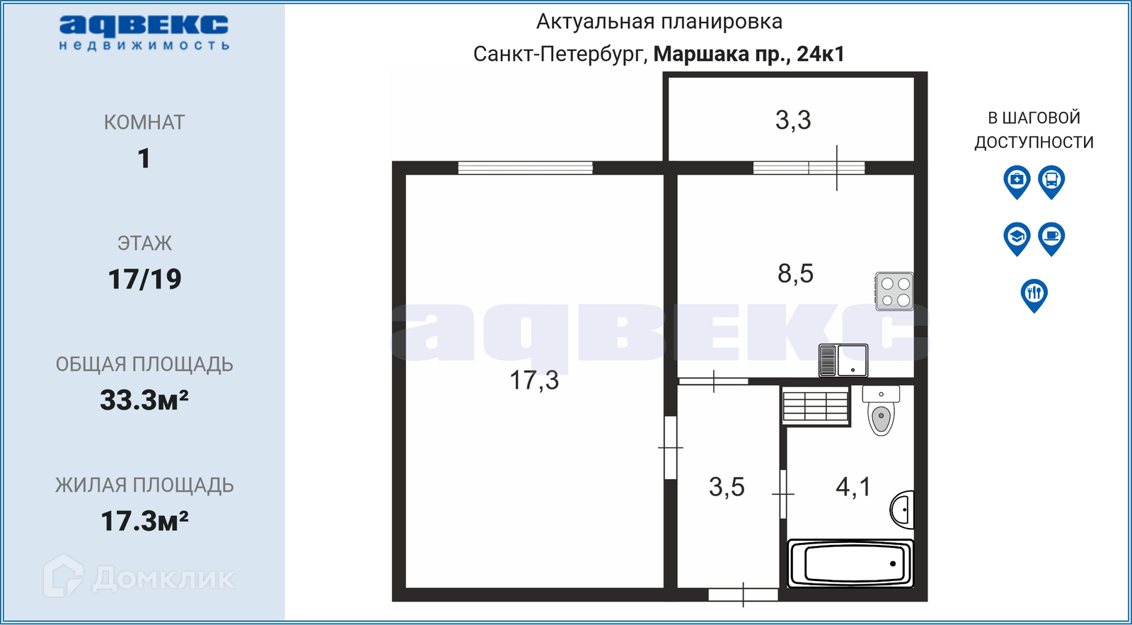 1-комнатная квартира, 33.3 м2, этаж 17 / 19, на продажу в Санкт-Петербурге, проспект Маршака, 24к1