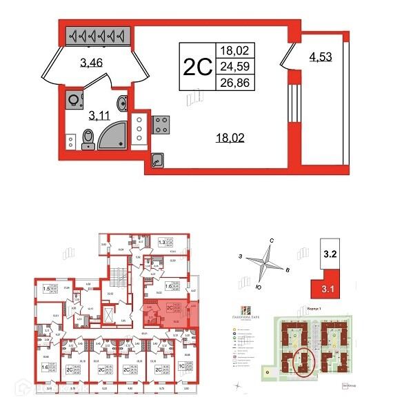 Общая площадь 24.3 м2