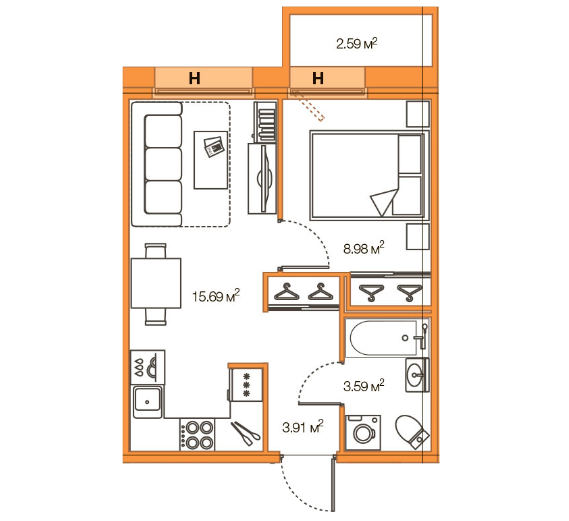 Площадь кухни-гостиной: 15.69 м2