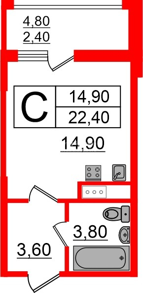 Общая площадь 22.4 м2