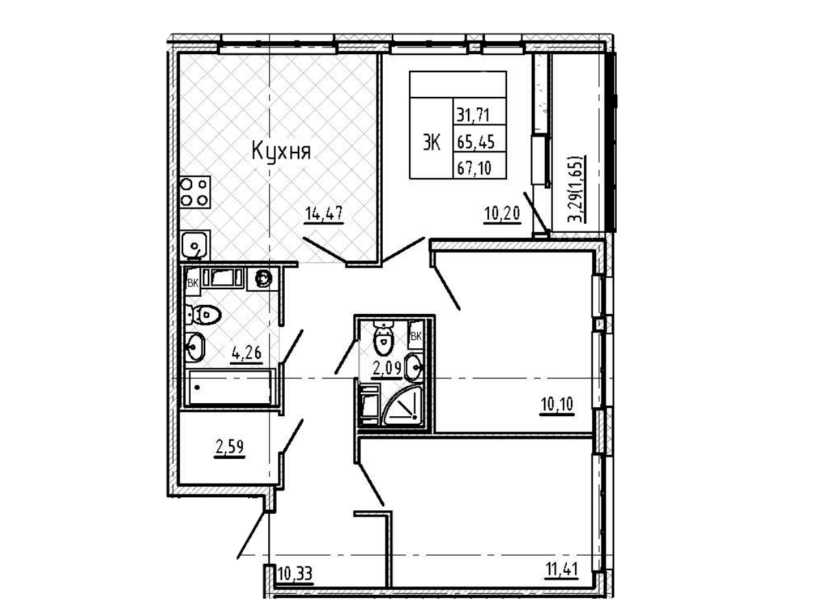 Общая площадь 65.45 м2
