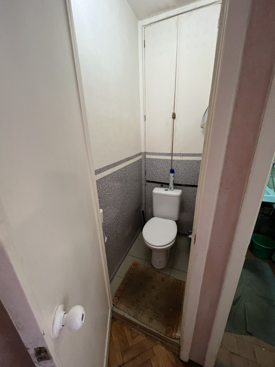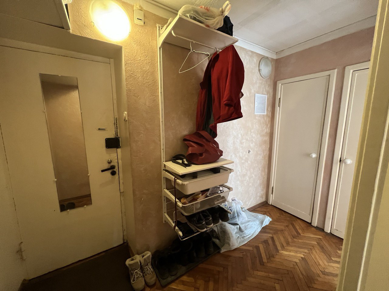 Пол - паркет, стены-обои. Прихожая - декоративная штукатурка. Ванная - чугун.