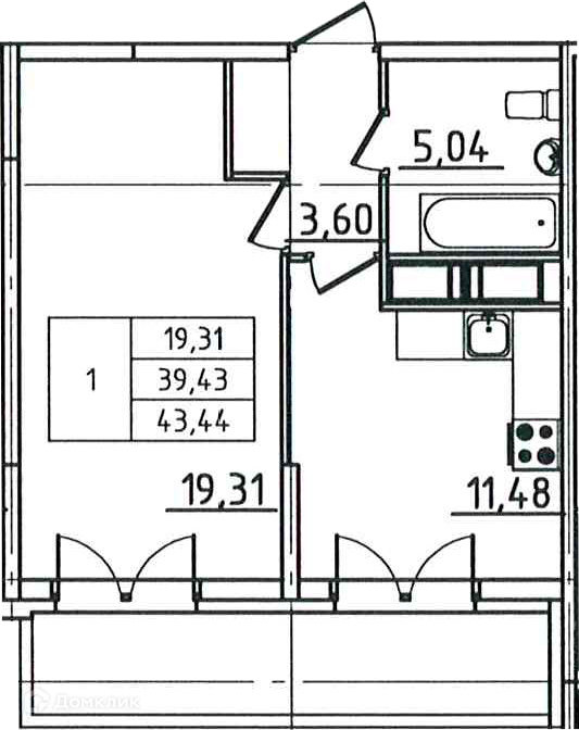 Общая площадь 43.44 м2
