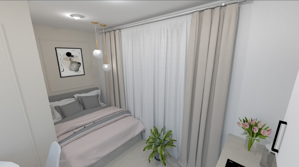 - Мебелью: спальное место, шкафы для хранения кухонных принадлежностей, стол, стулья.