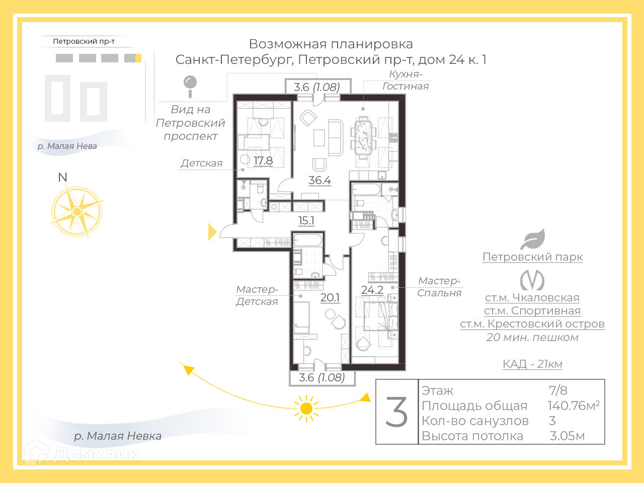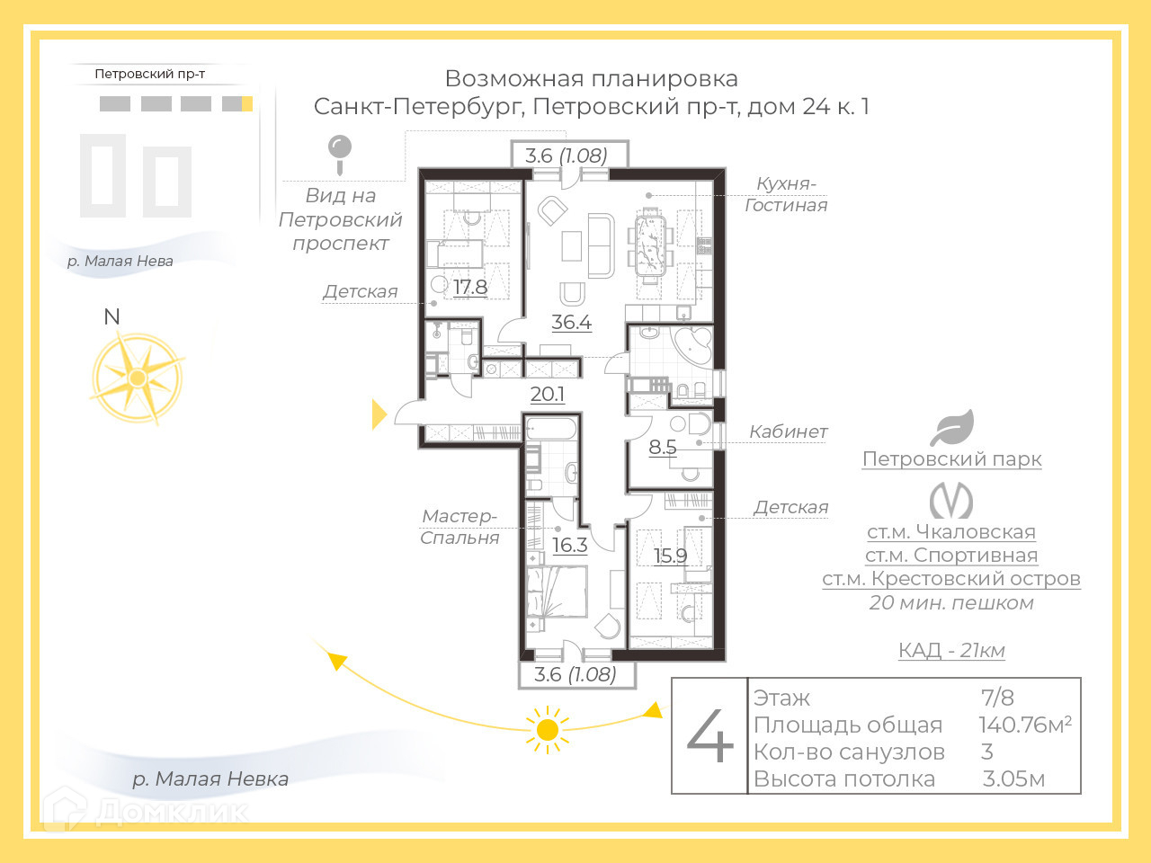 3-комнатная квартира, 141 м2, этаж 7 / 8, на продажу в Санкт-Петербурге, Петровский проспект, 24к1