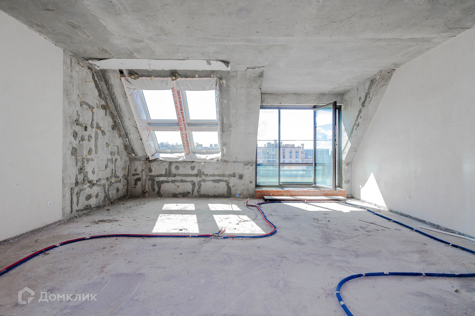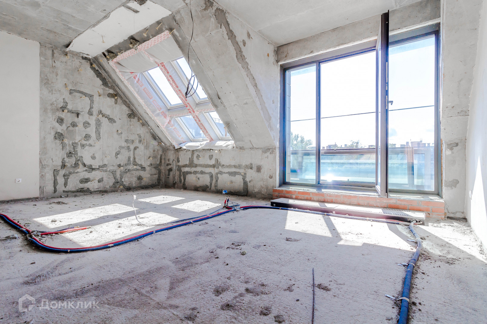 большую кухню-гостиную с мансардными окнами и выходом на балкон