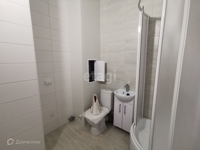 Совместный санузел облицован плиткой, установлена душевая кабина, раковина и унитаз