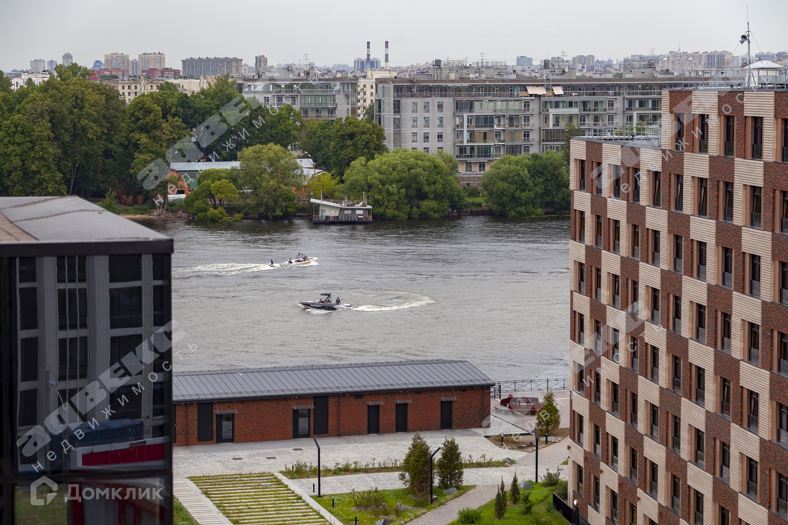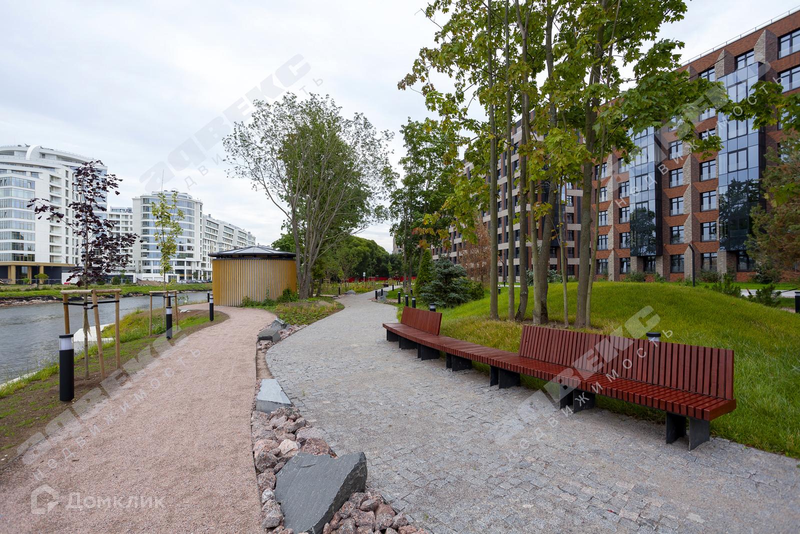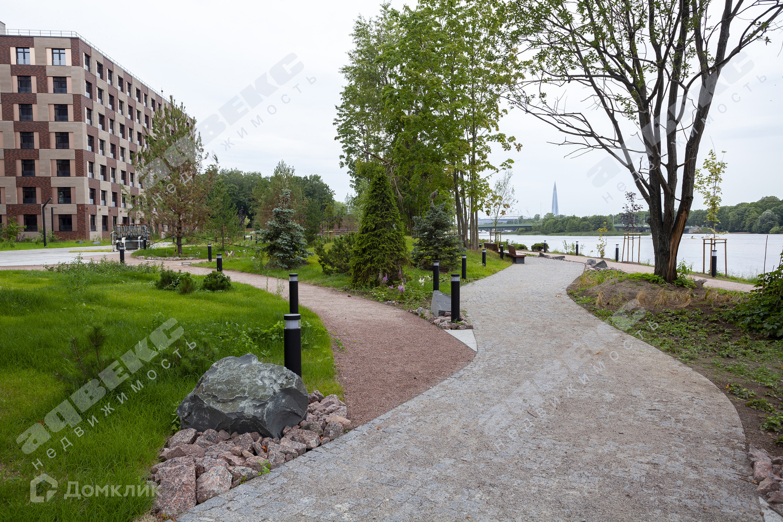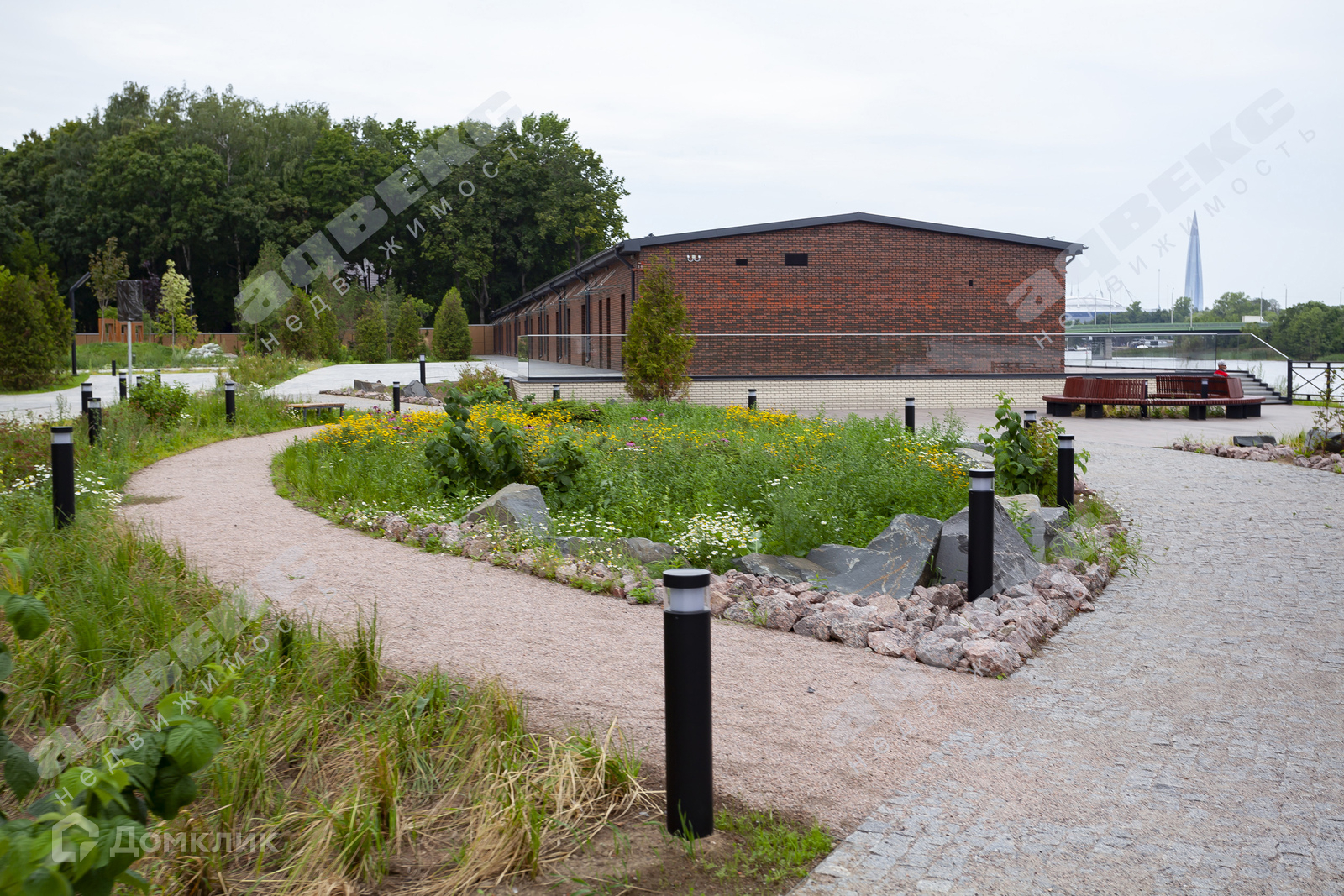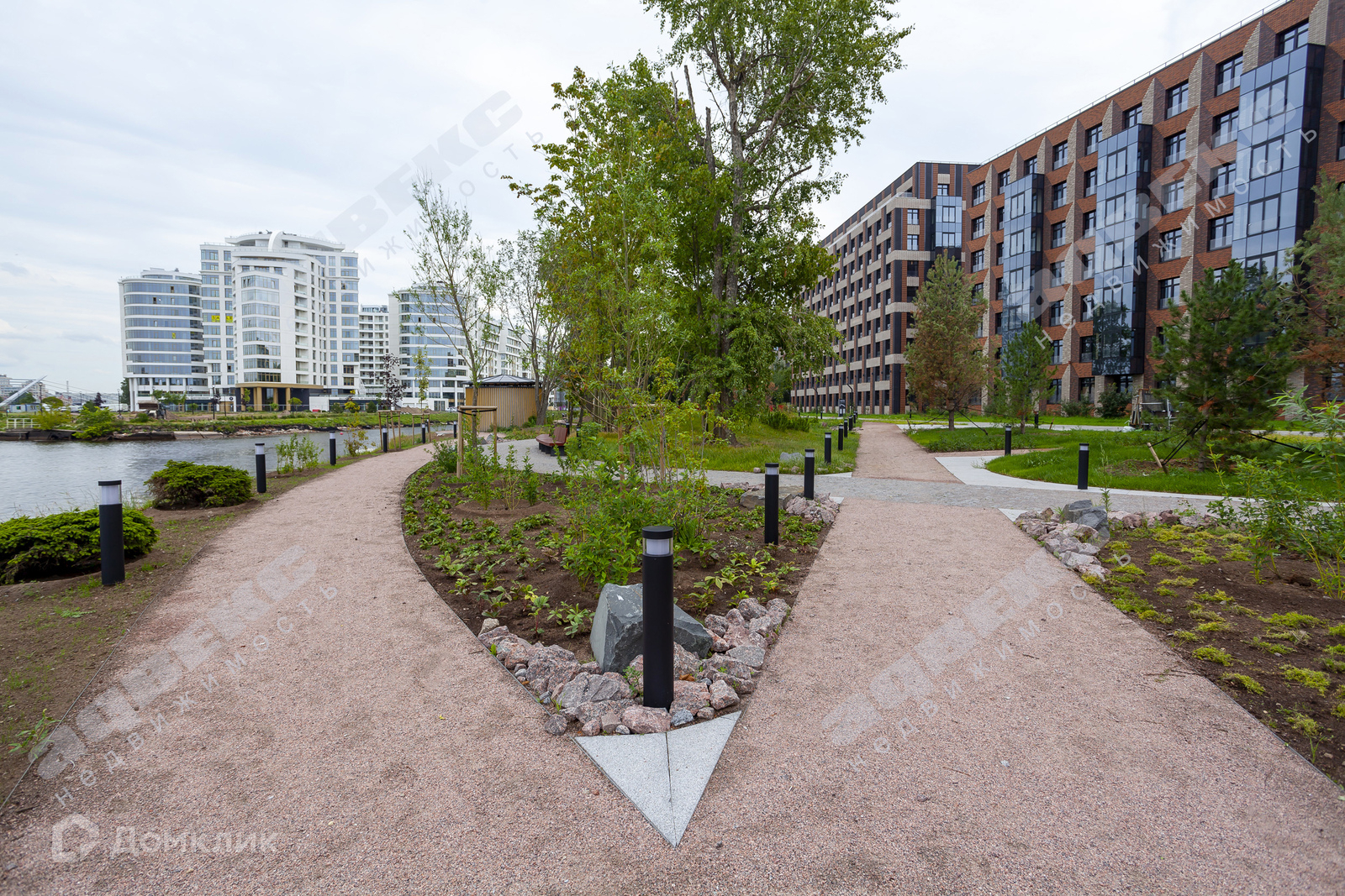 Территория комплекса огромна, имеет свою прогулочную благоустроенную набережную, с зонами отдыха, причалами, видом на Малую Невку и зелень парка Крестовского острова. Сюжетная подсветка в вечернее и ночное время.