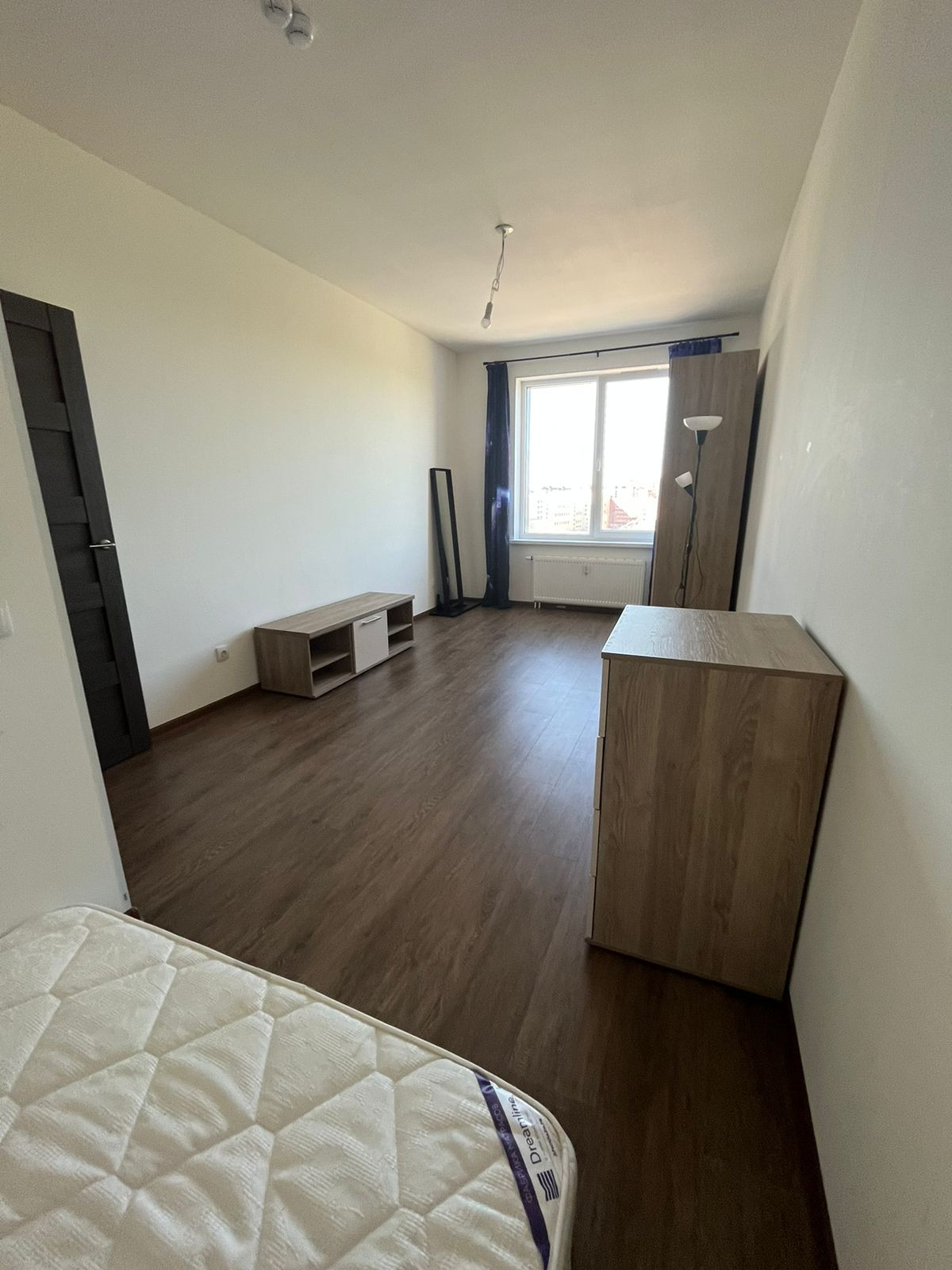 - Комната удобная по форме, так как можно поставить полноценную кровать и отдельно диван.