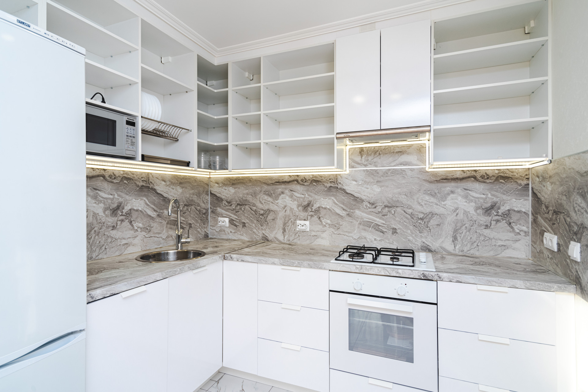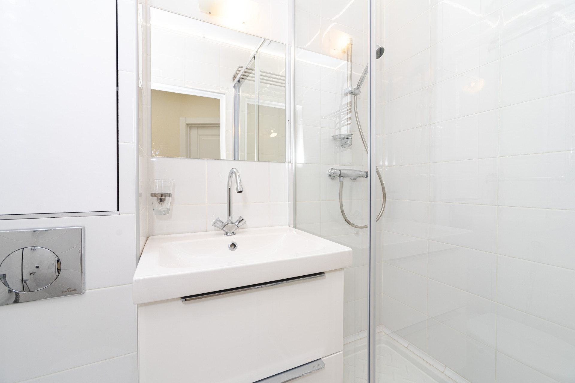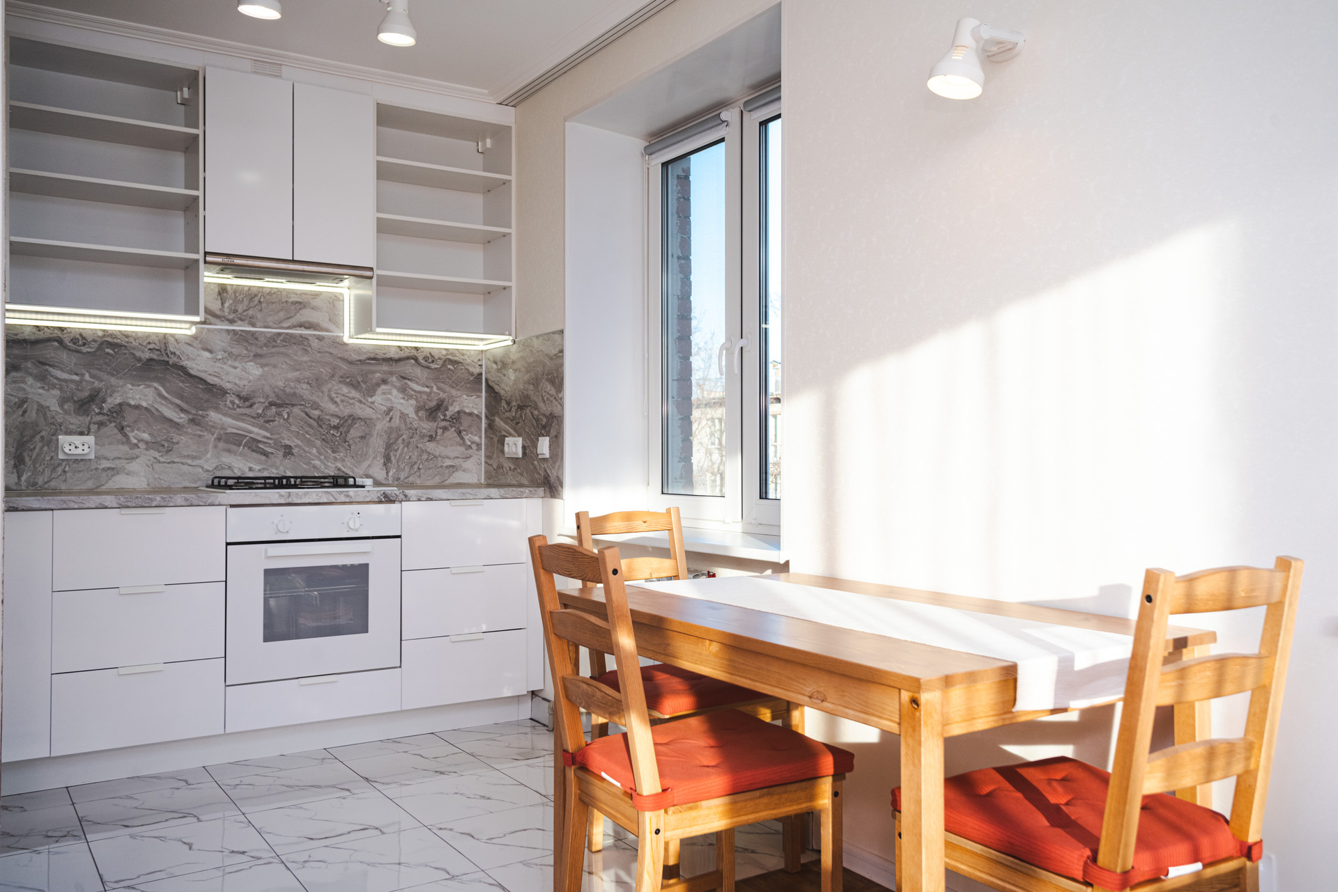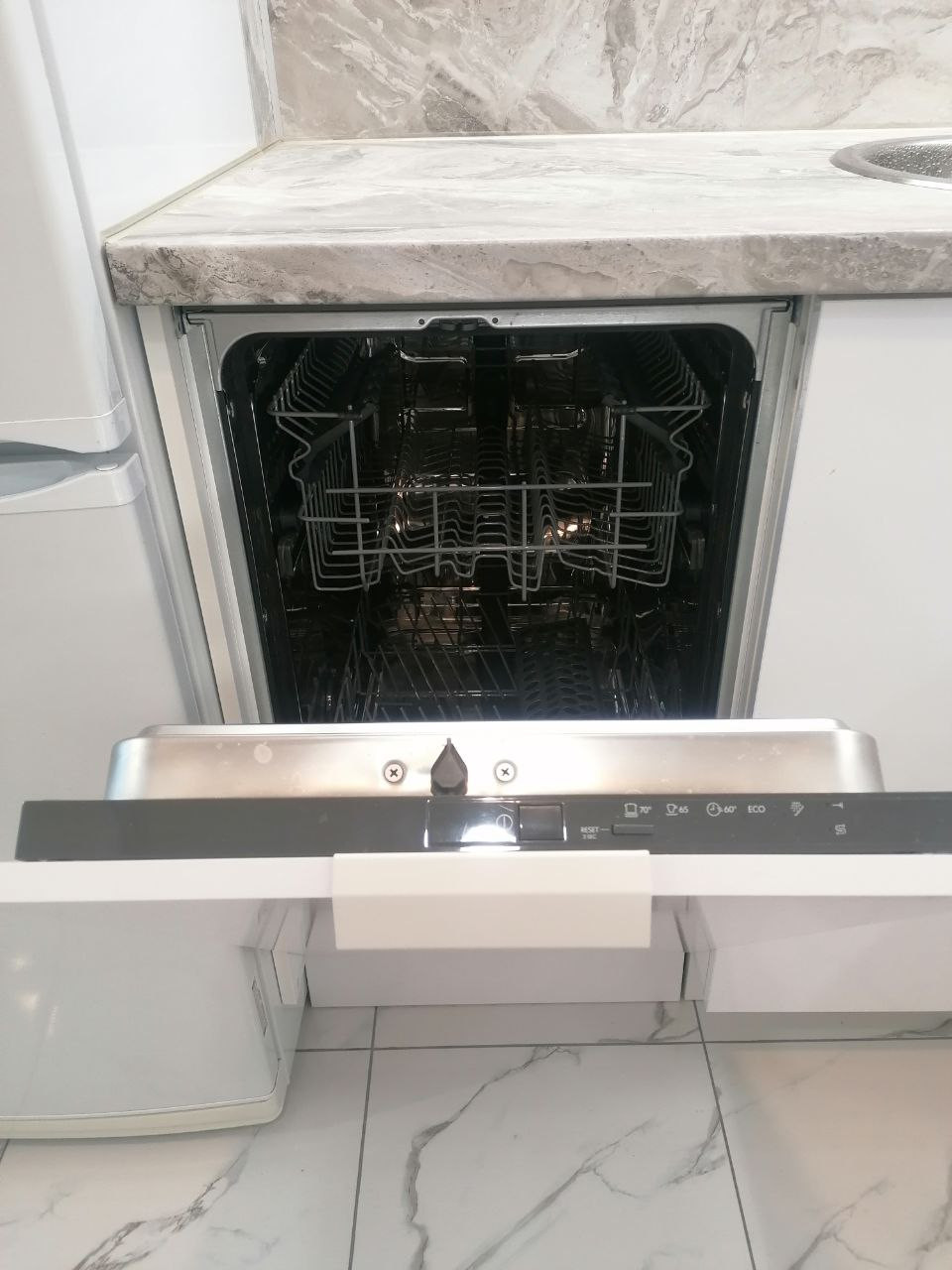 Встроенные шкафы купе с ящиками плавного выдвижения, много мест для хранения. Просторная кухня с качественной техникой - посудомоечная машина, холодильник, духовка, варочная поверхность.