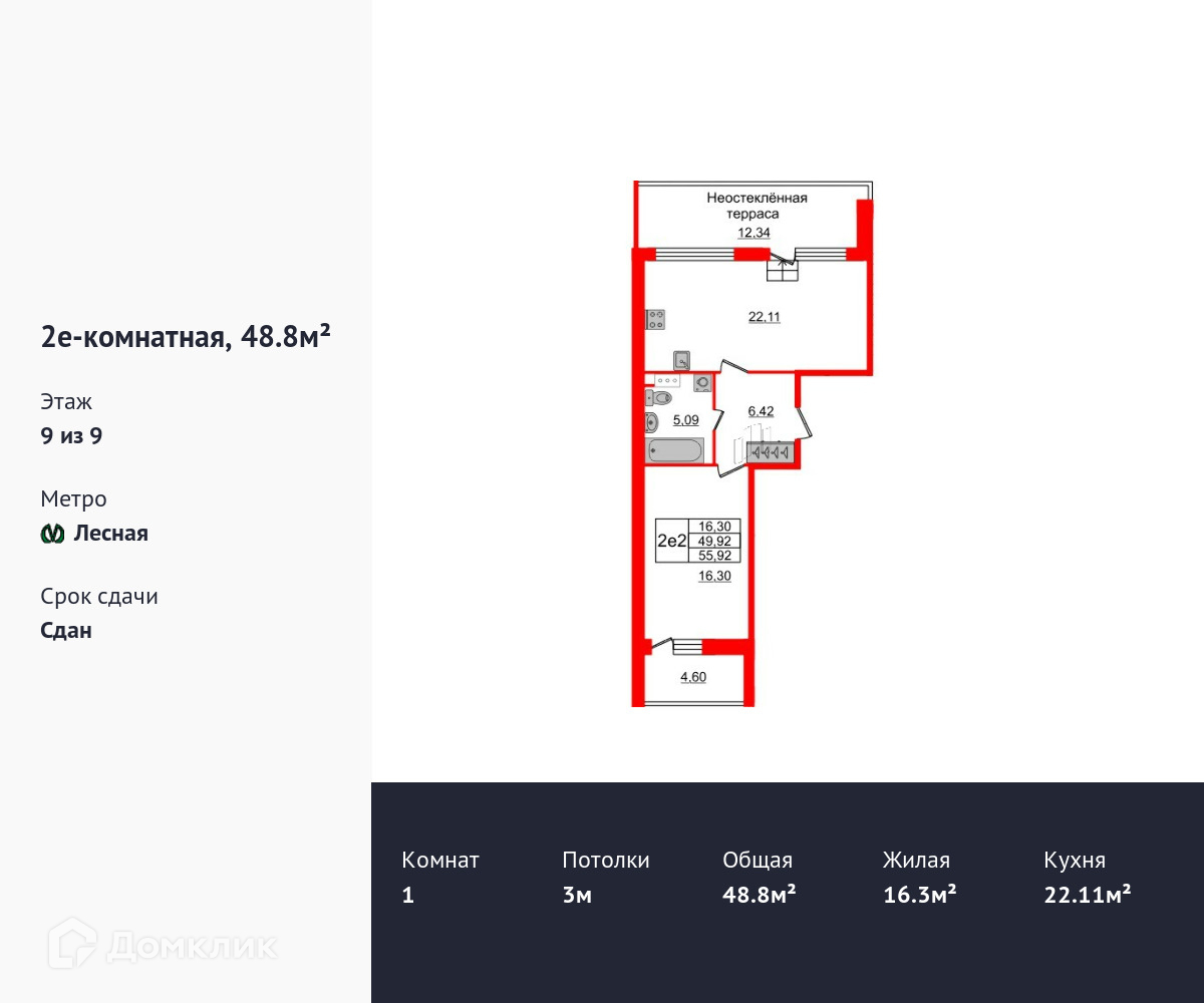 Уникальная, функциональная европланировка, большая кухня-гостиная 22.11 м², просторная прихожая 6.42 м². Общая площадь квартиры - 48.8 м², жилая – 16.3 м², высота потолка 3 м.