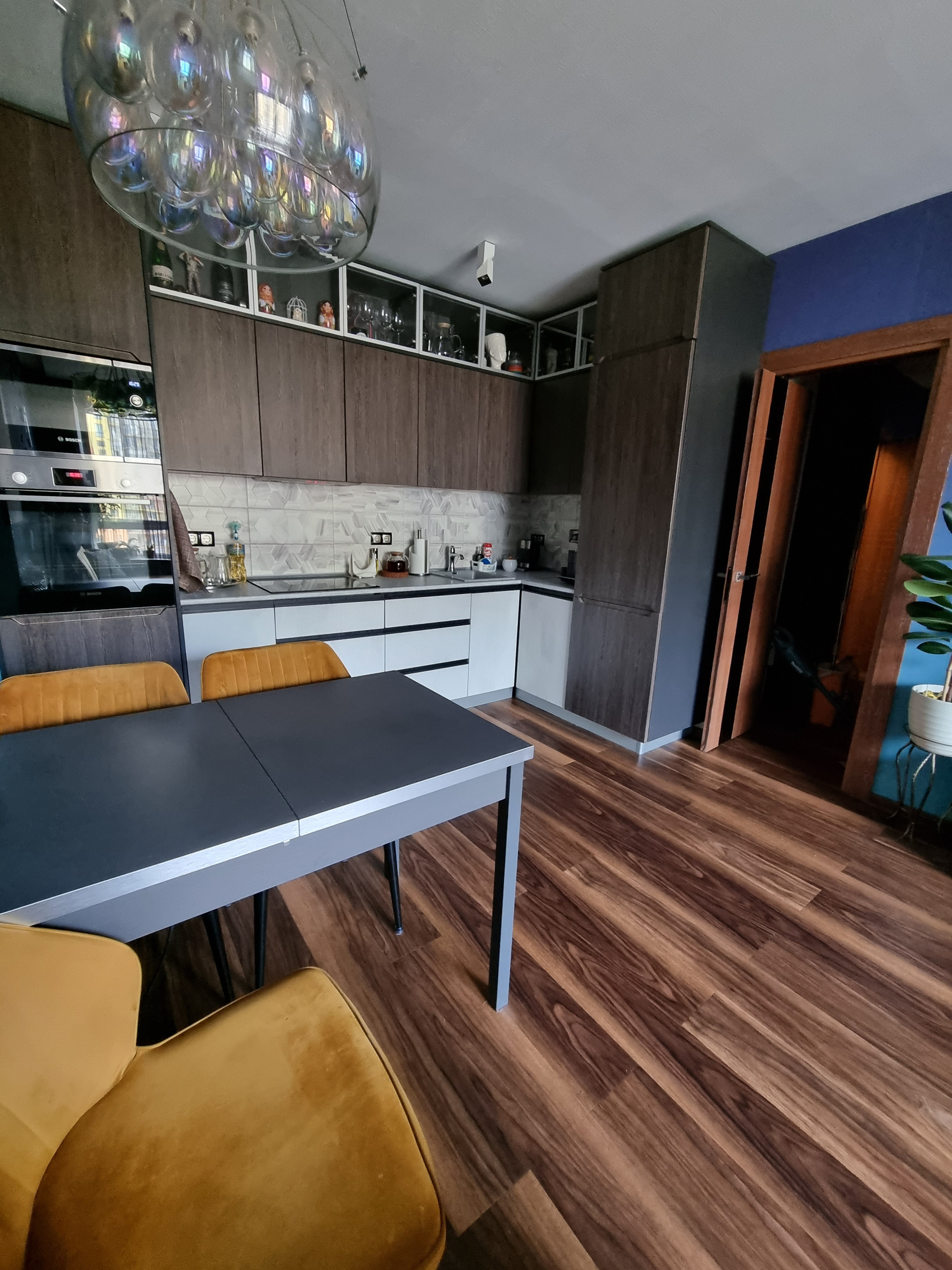 Две спальни и большая кухня-гостиная, почти вся мебель и вся встроенная техника остаются в квартире (забираем только кровать, диван, телевизоры, стиральную и сушильную машинки). Дизайнерский ремонт.