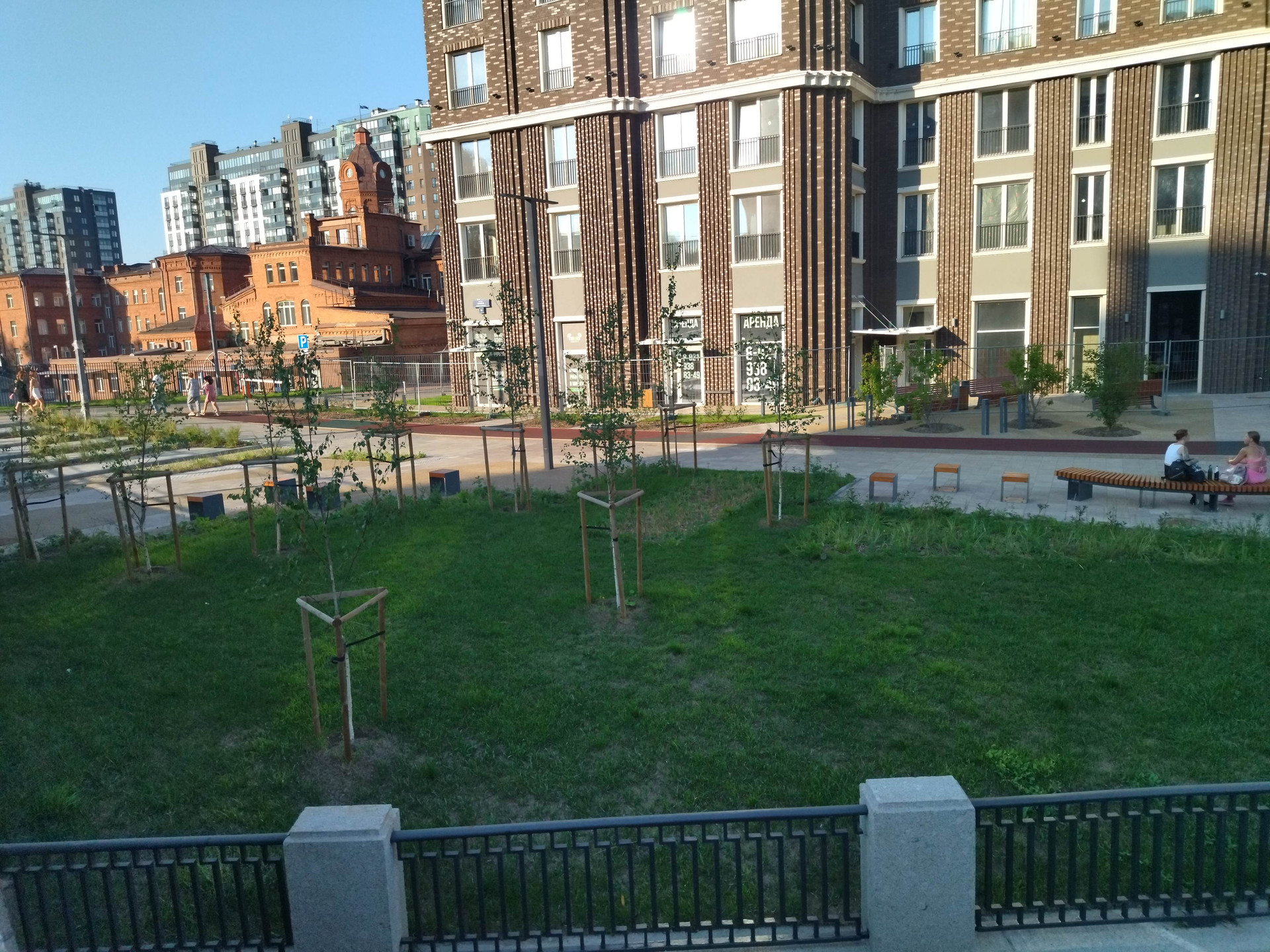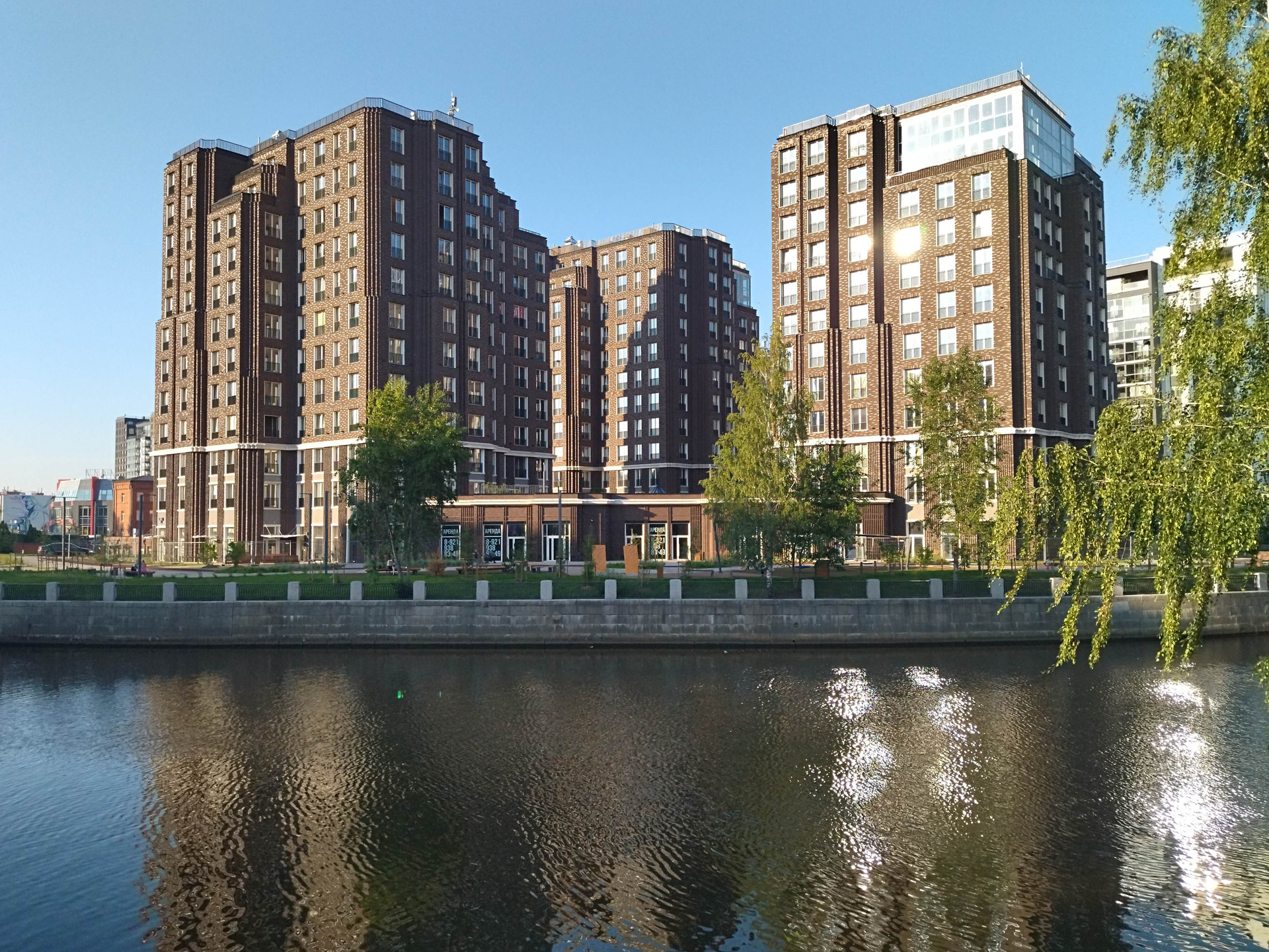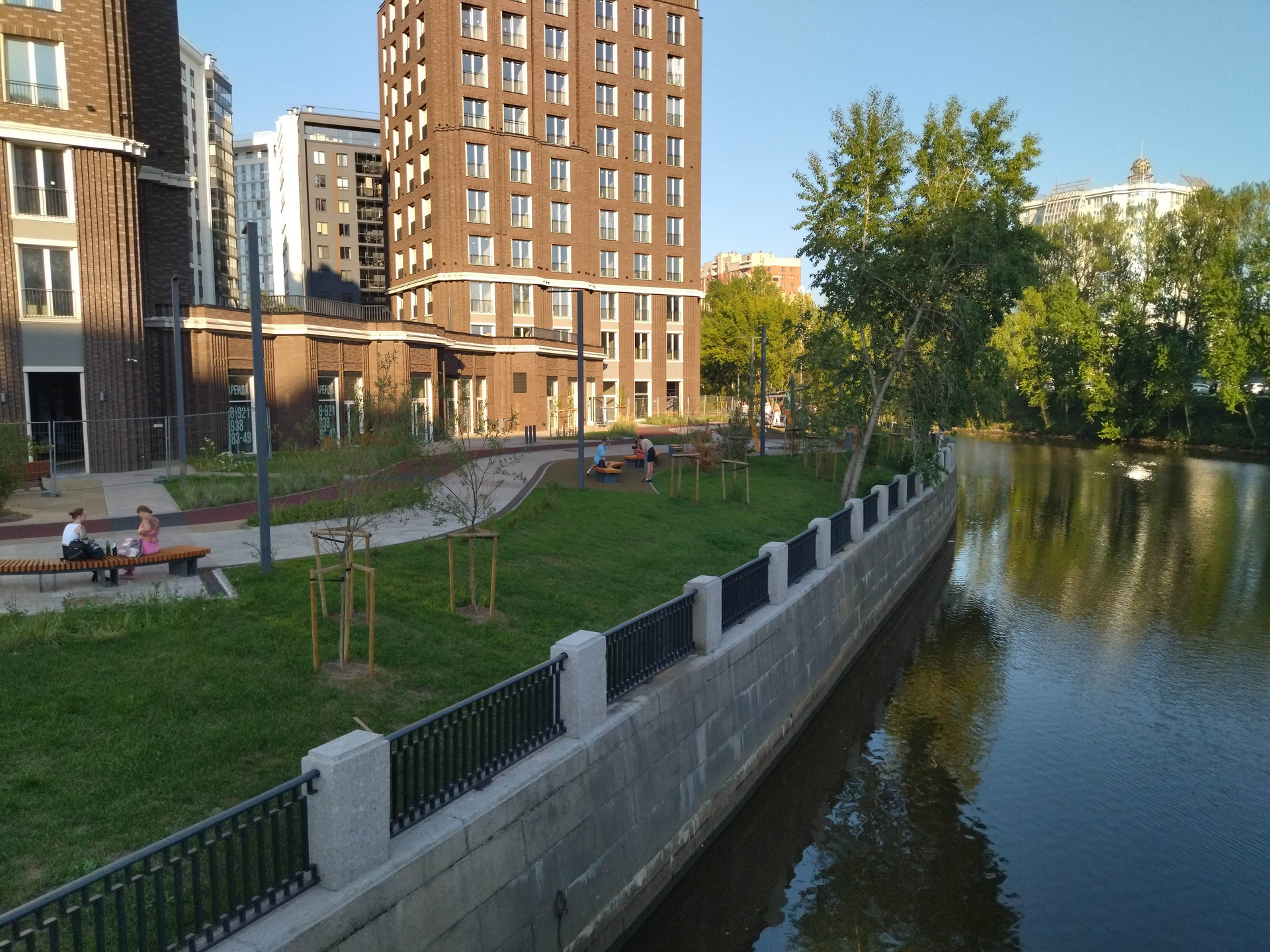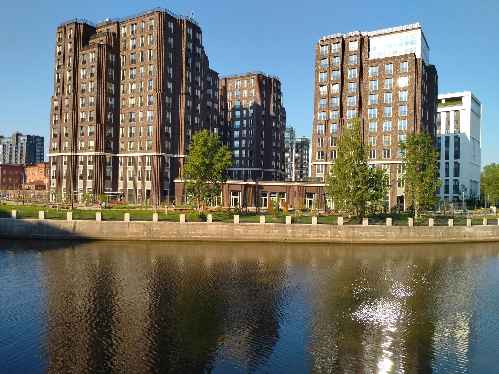 В ходе реконструкции набережной Охты перед жилым комплексом появилось современное общественное пространство с игровыми площадками и зонами отдыха. Во дворе, на стилобате предусмотрены игровые площадки и зоны отдыха.
