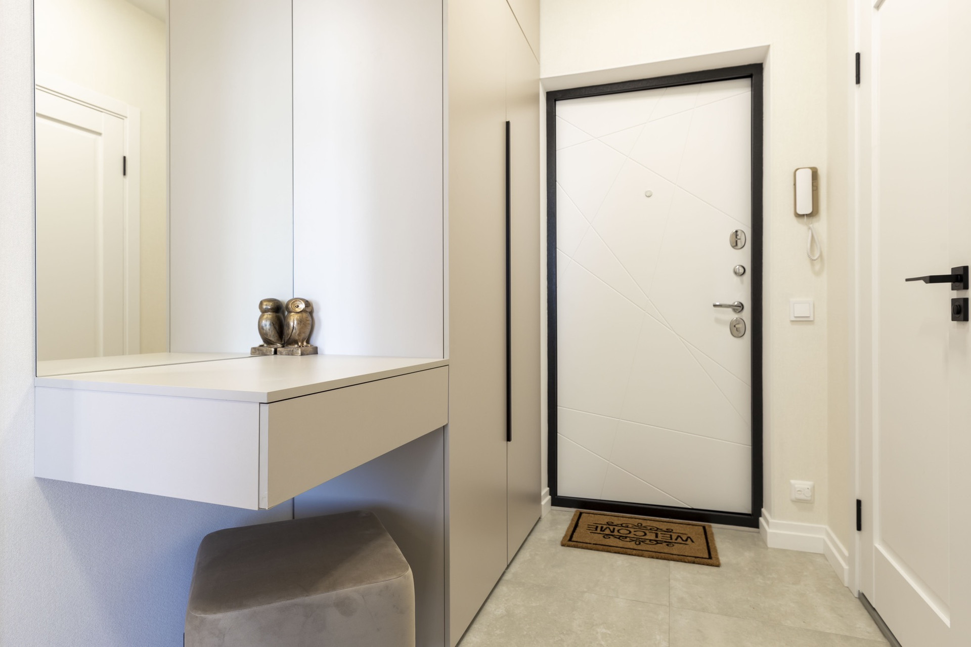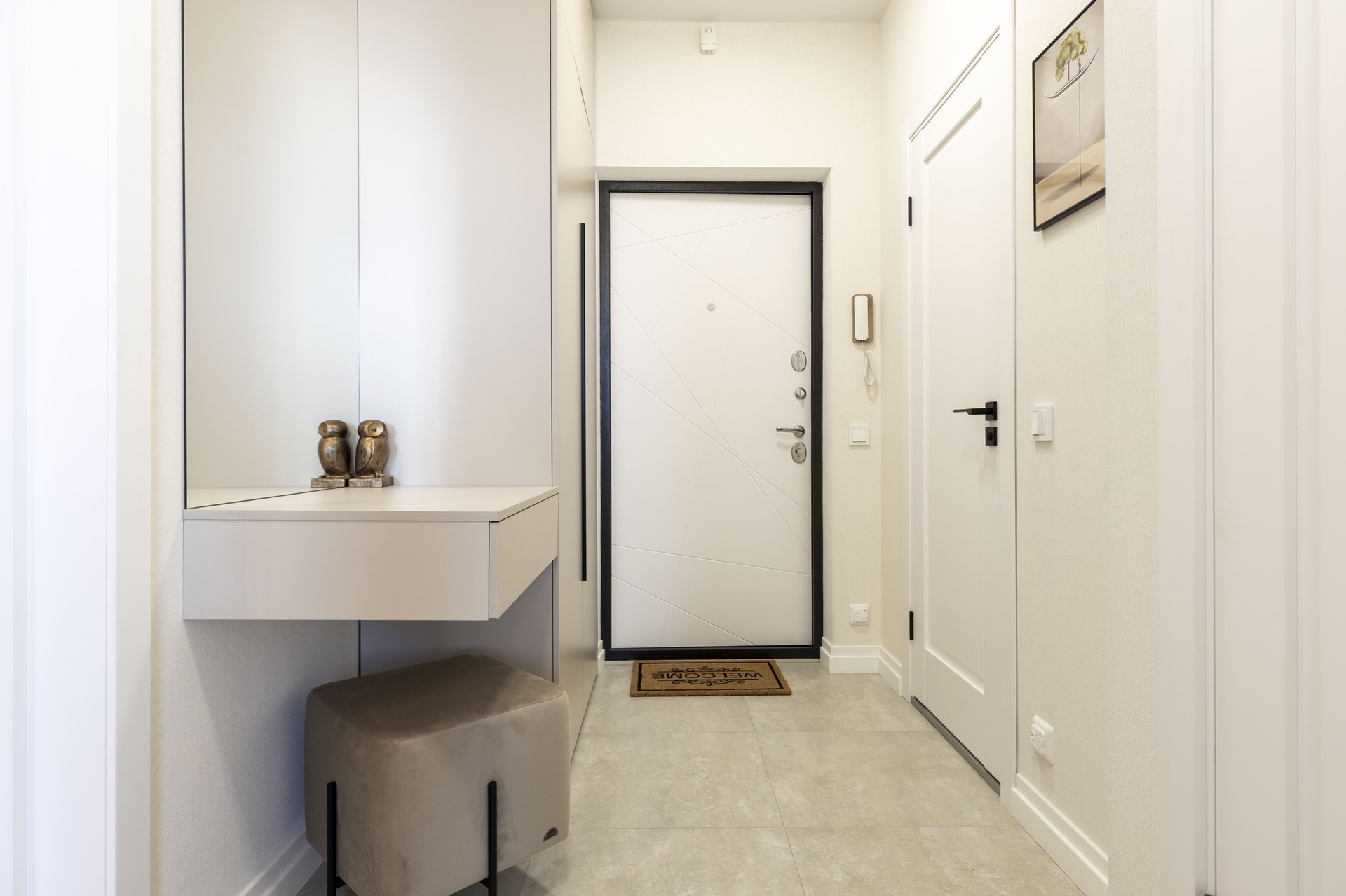 При входе расположен просторный шкаф для хранения верхней одежды и обуви, а так же тумба с пуфиком и зеркало. В шкафу находится эл
