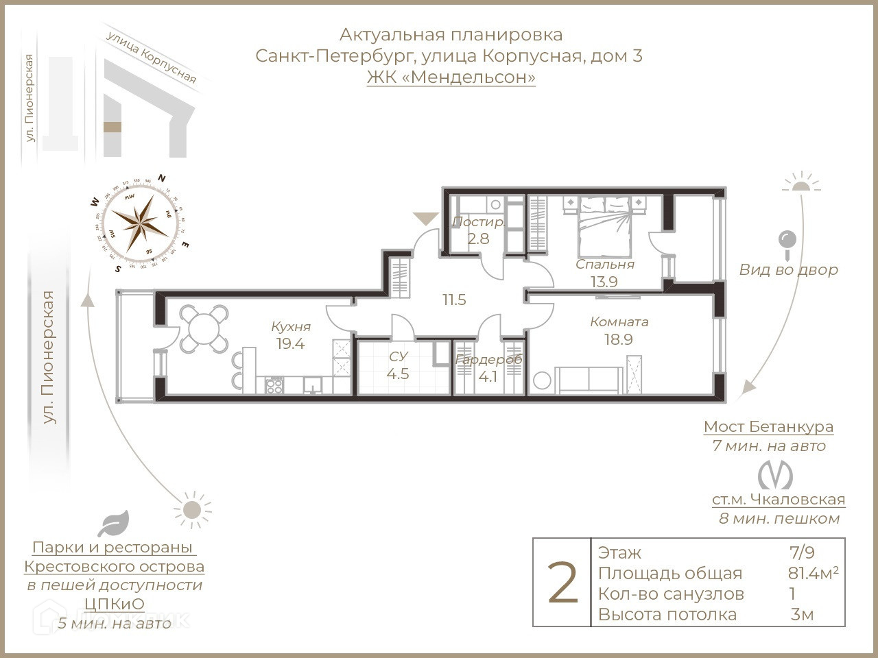 2-комнатная квартира, 81.44 м2, этаж 7 / 9, на продажу в Санкт-Петербурге, Корпусная улица, 3