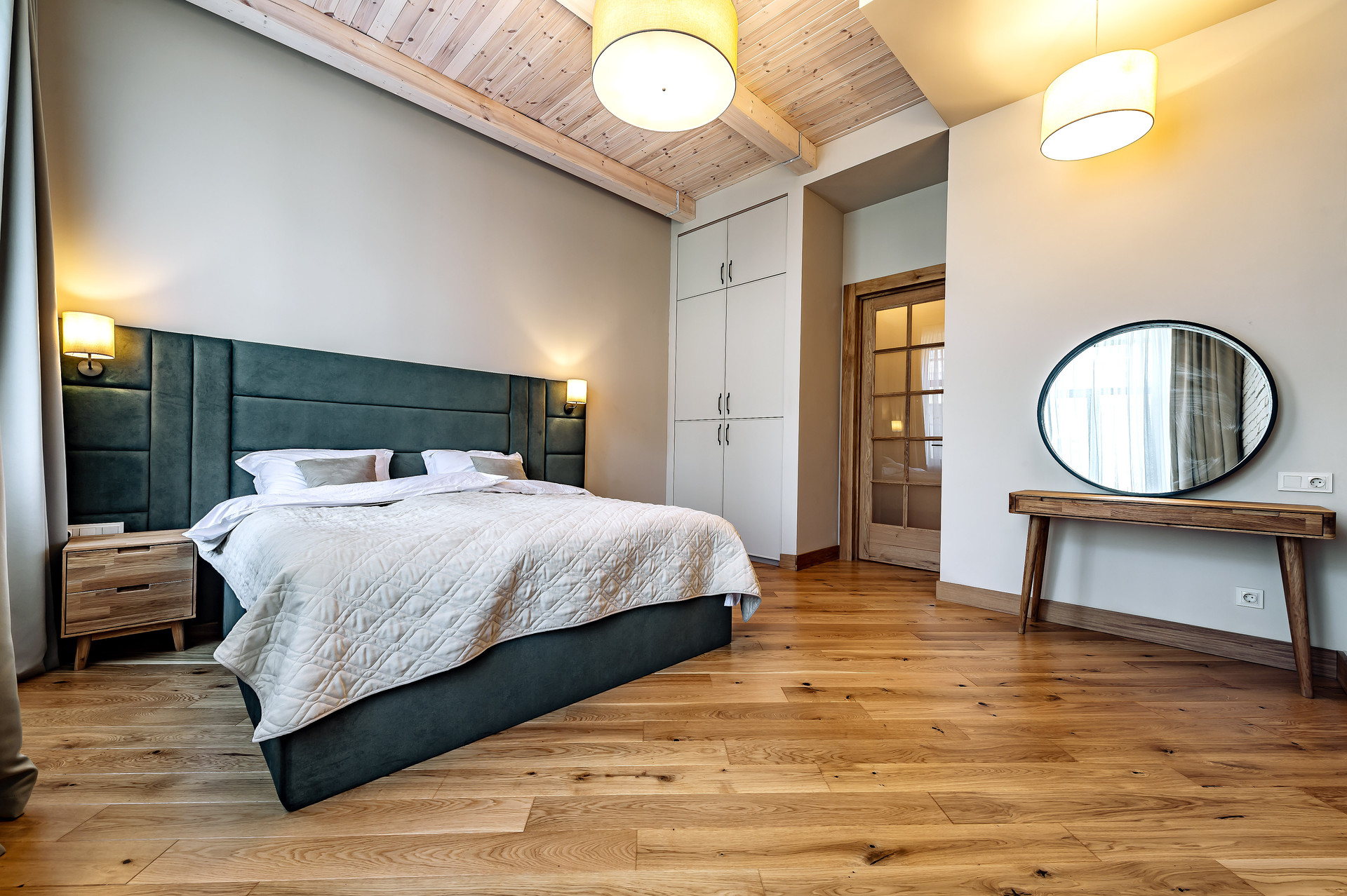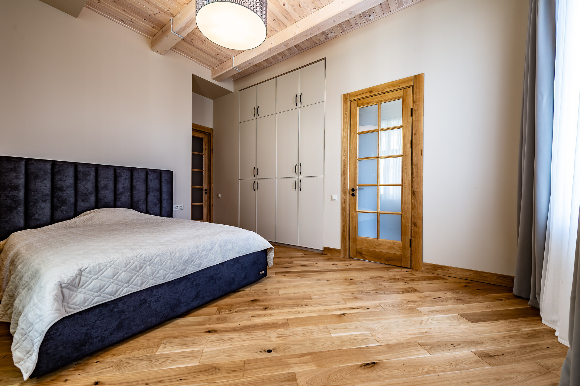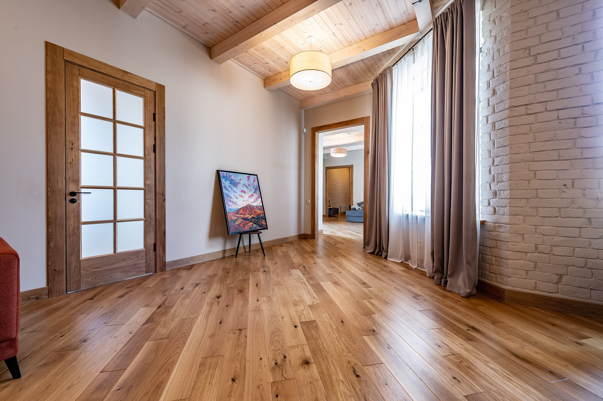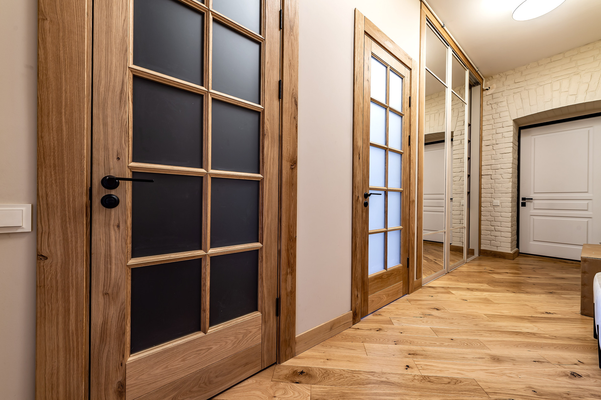 Для ремонта использованы натуральные качественные материалы. Пол, двери, подоконники выполнены из массива натурального дуба. В квартире есть основная мебель и техника, большие встроенные шкафы.