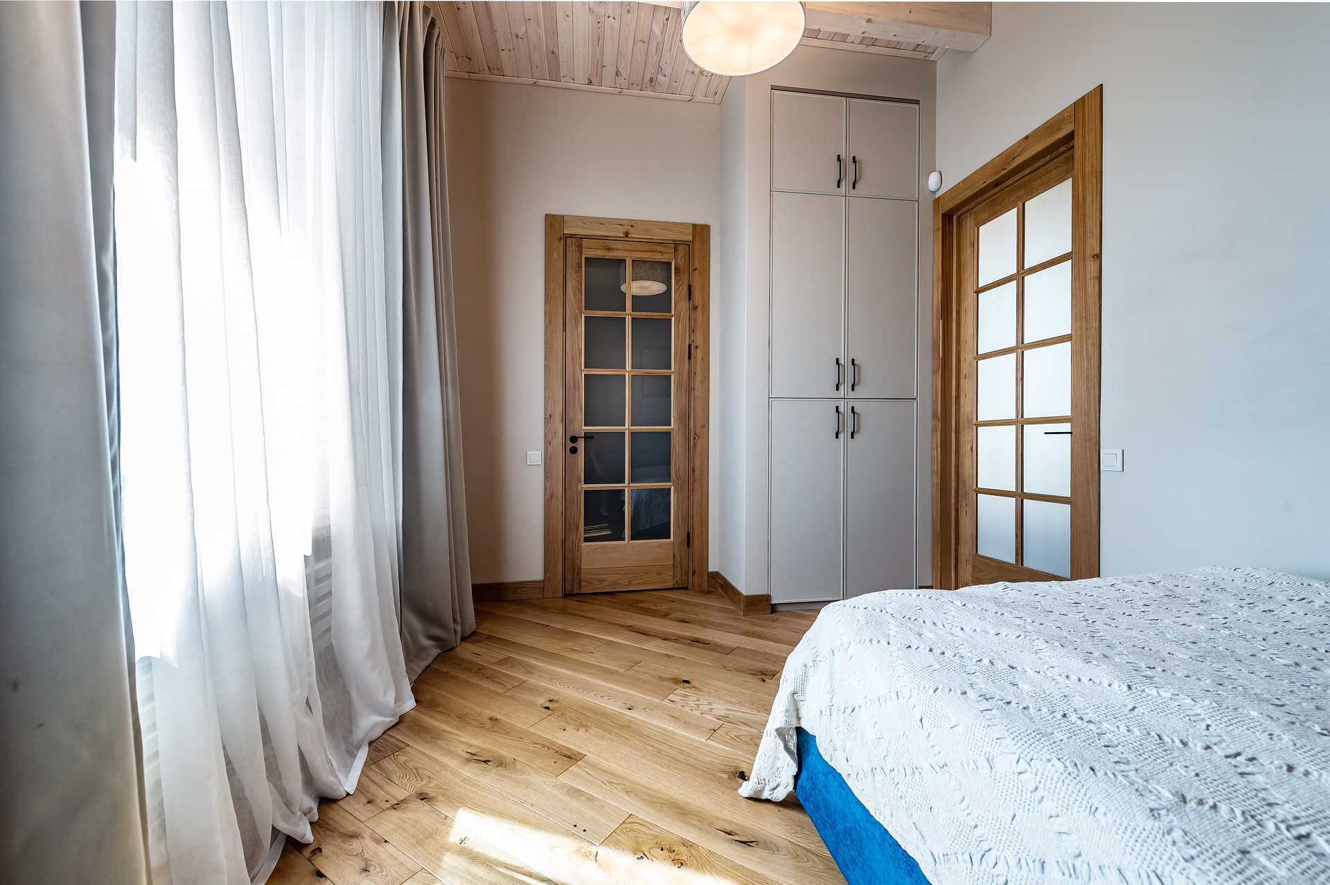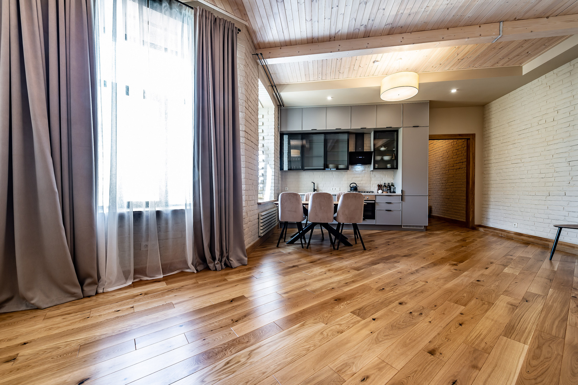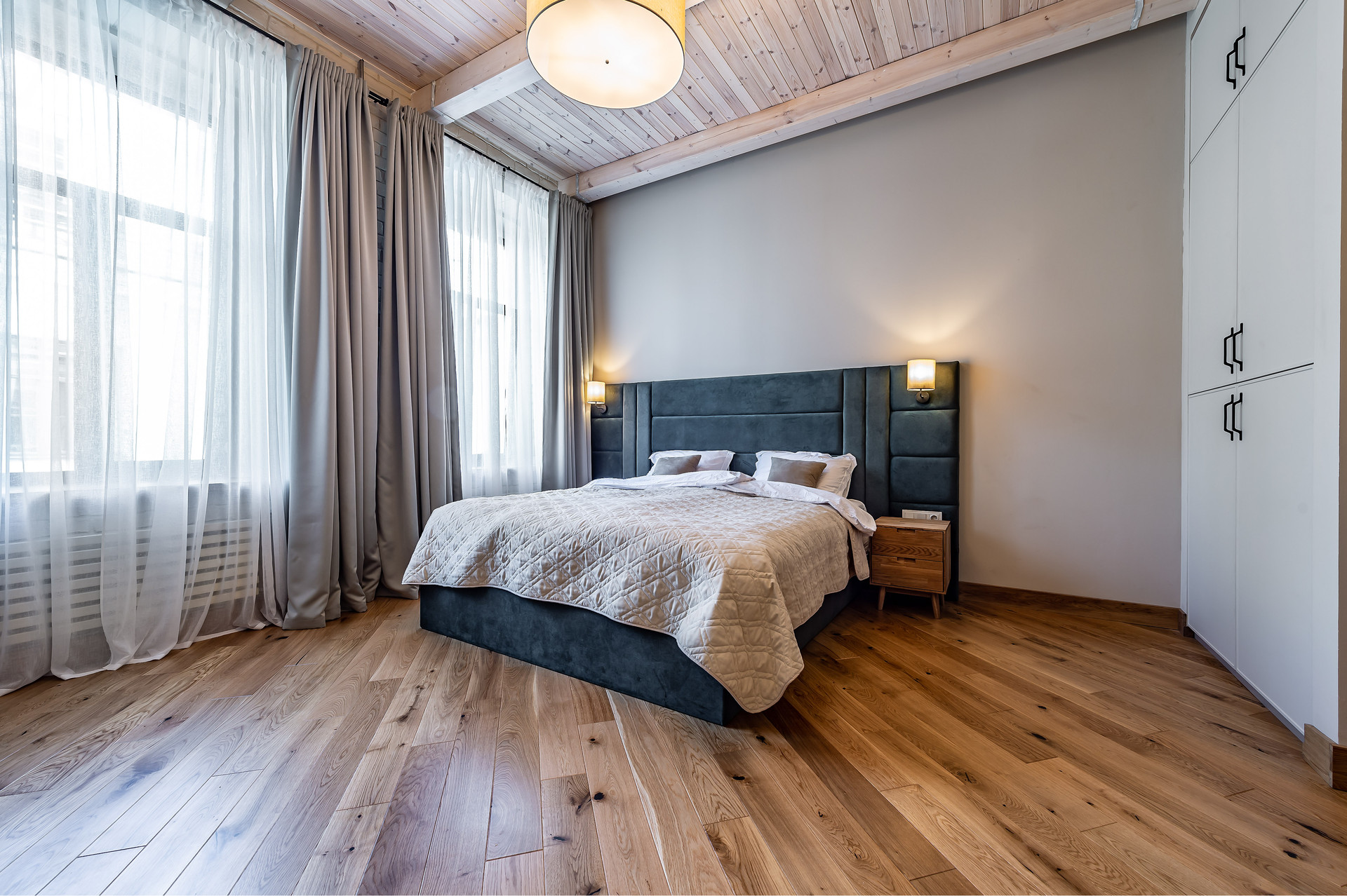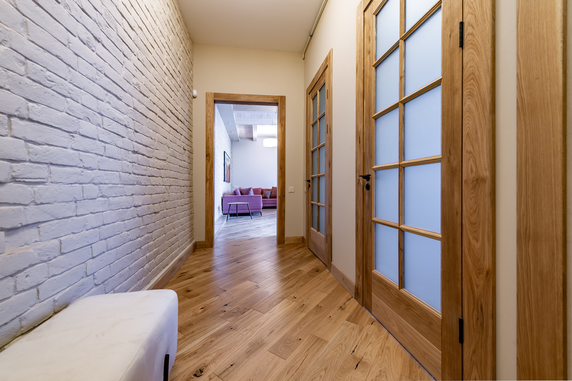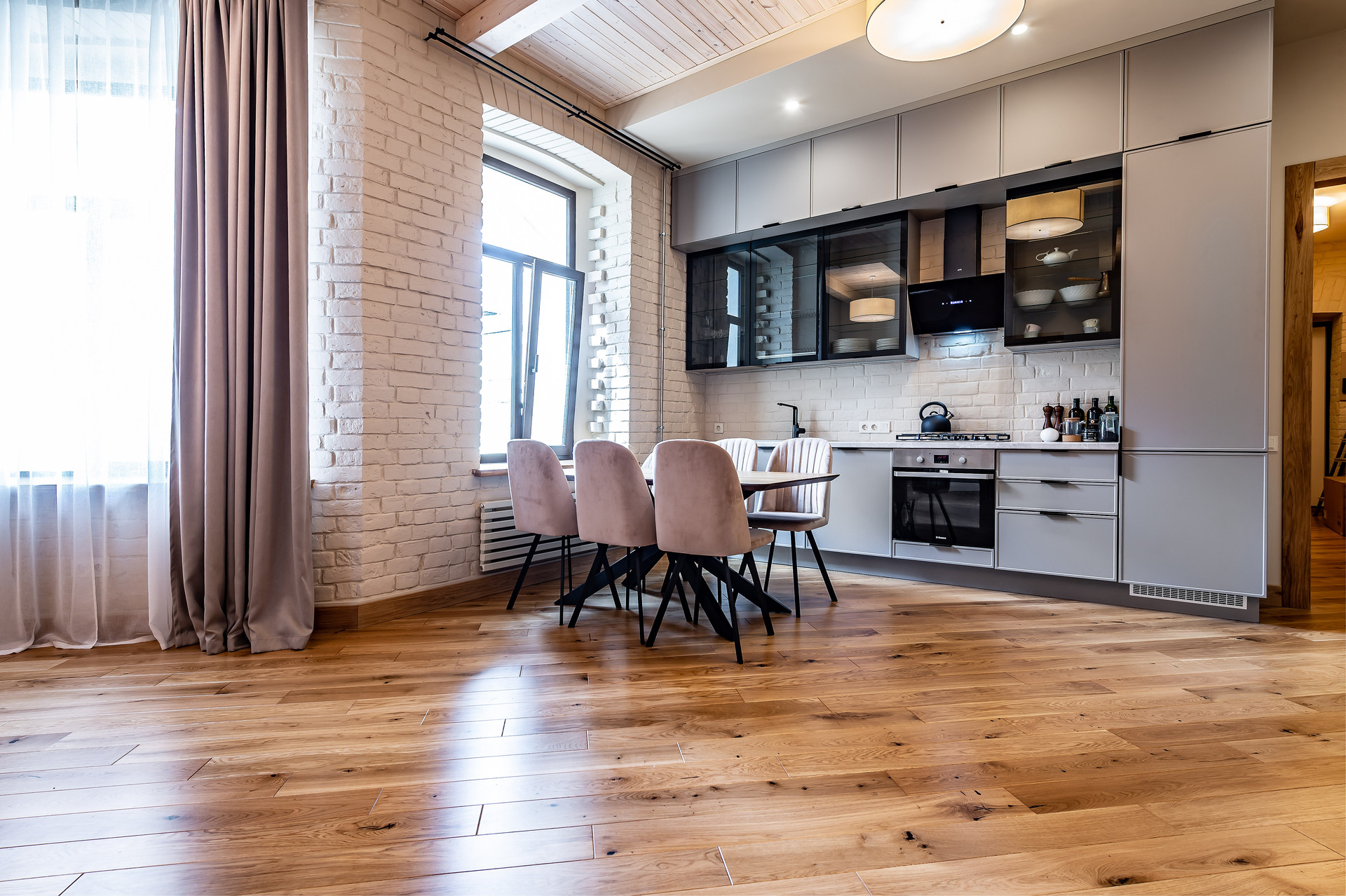 Для ремонта использованы натуральные качественные материалы. Пол, двери, подоконники выполнены из массива натурального дуба. В квартире есть основная мебель и техника, большие встроенные шкафы.