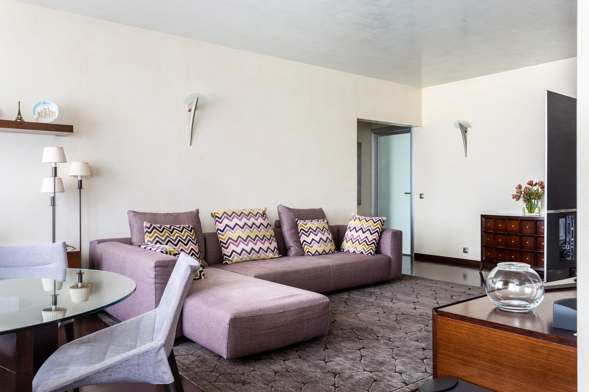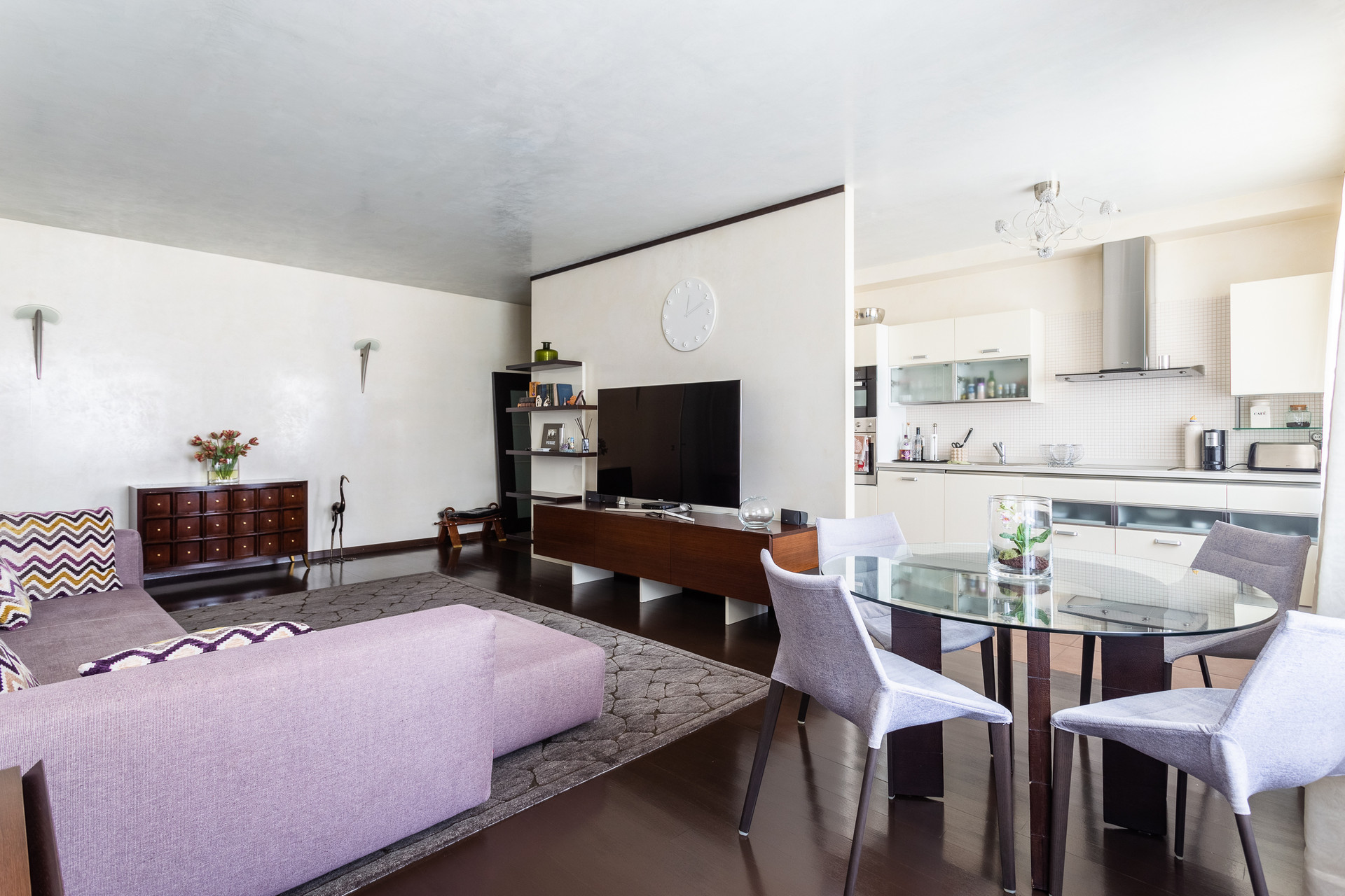 Квартира состоит из просторной кухни-гостиной (40 кв.м.) и двух спален (19.3 включая гардеробную и 14.9 кв.м.), двух санузлов (4.4 +2 кв.м.), балкона (3.3 кв.м.). Вид из окон на две стороны.