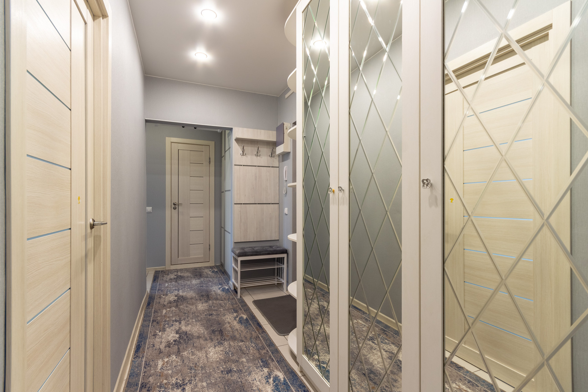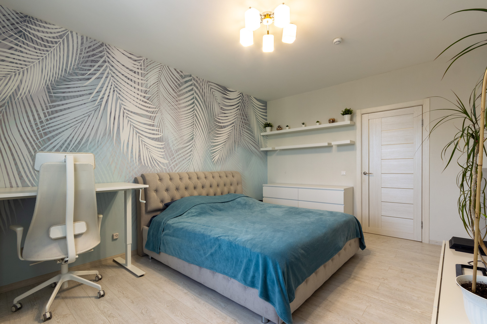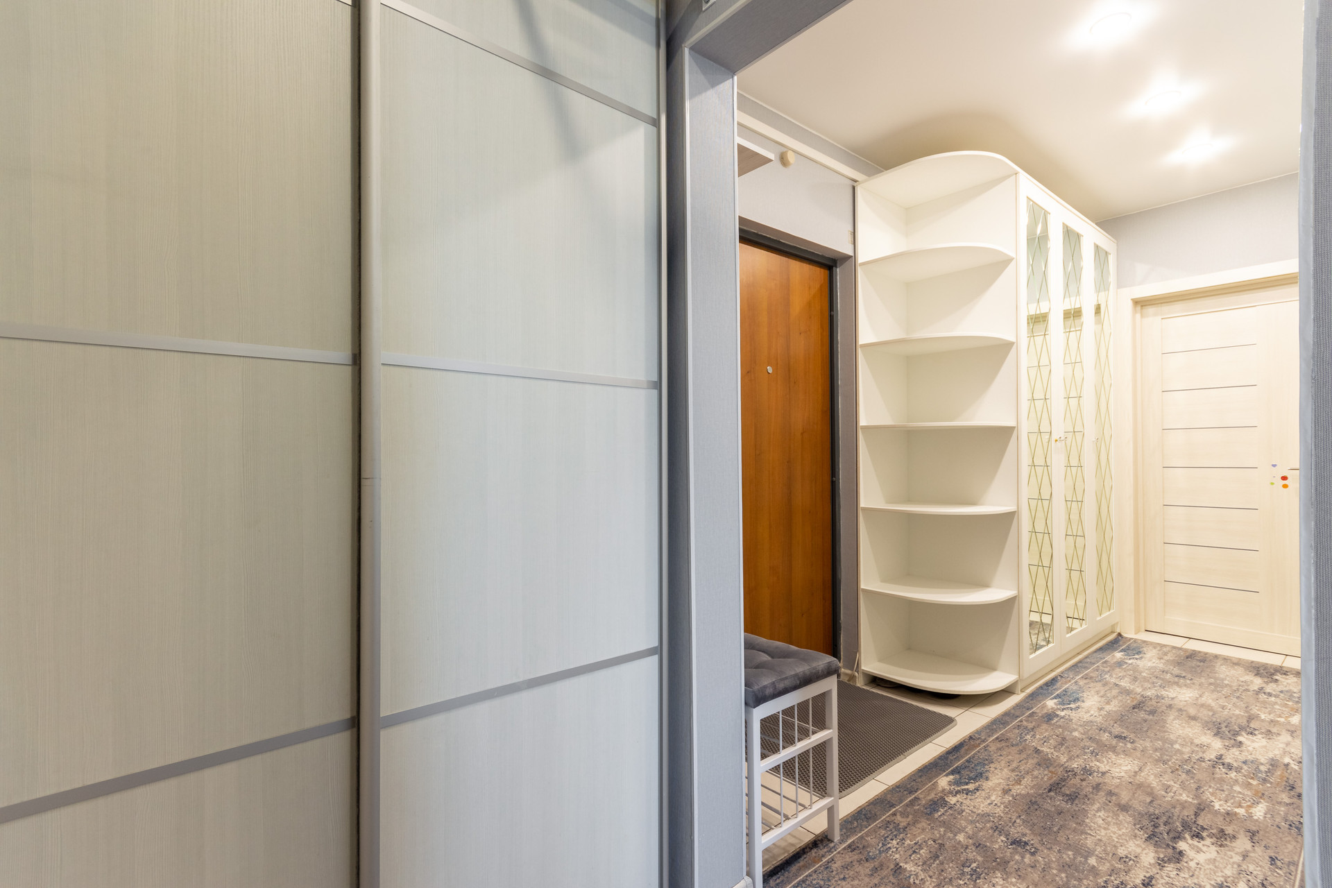 Продуманы системы хранения: два вестимых шкафа в коридоре и прихожая с мягкой скамьей, в спальне кровать с подъемным механизмом и местом для хранения, где можно хранить вещи, качественный матрас «Орматек» тумба под телевизор и вместительный шкаф «Икеа», на балконе гармонично вместили стеллаж и комод как дополнительные места хранения.