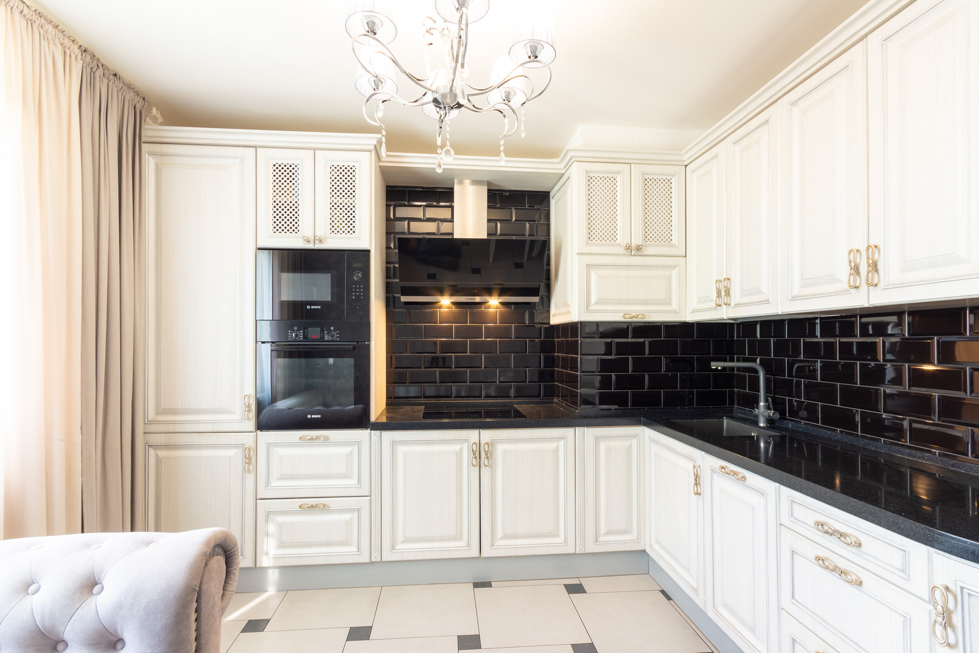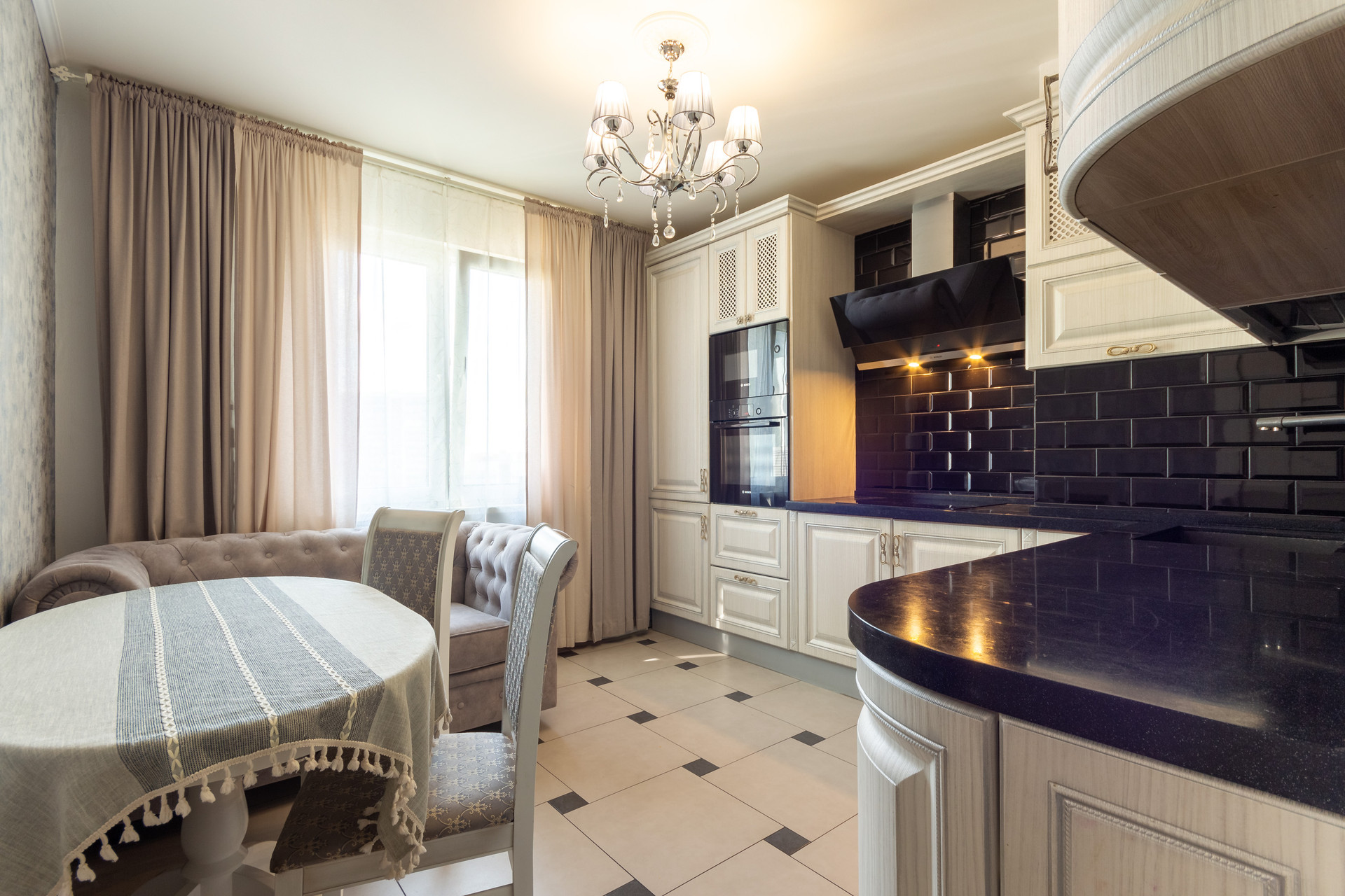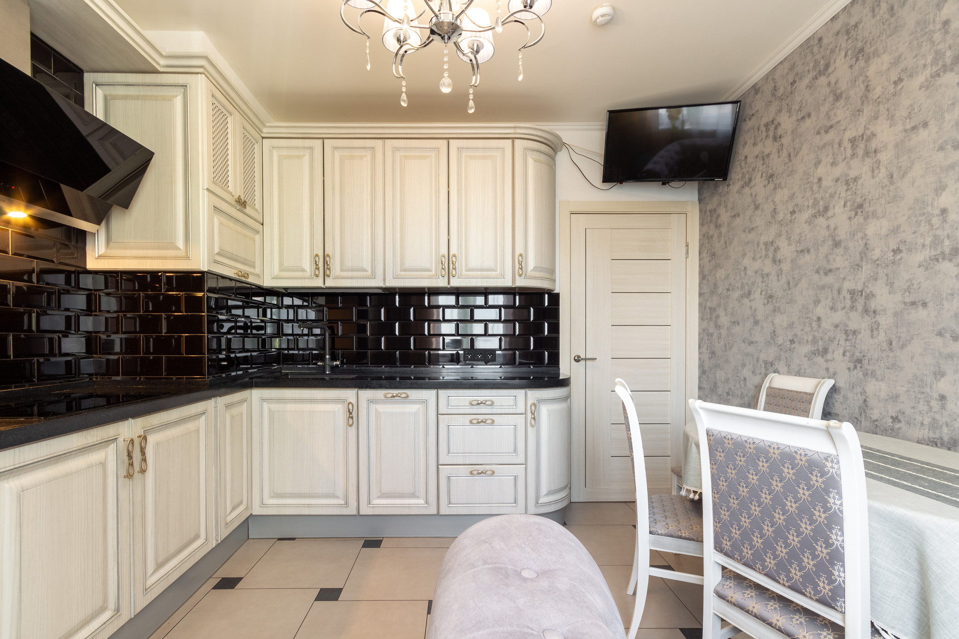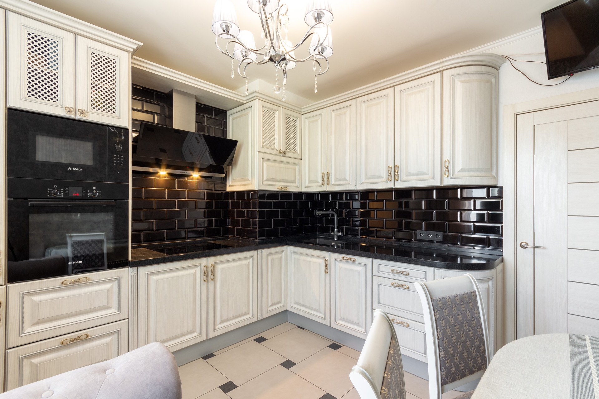 Кухня оформлена в классическом стиле и продумана до мелочей: красивый обеденный стол и удобные мягкие 4 стула, трехступенчатая система очистки воды, качественная мебель на кухне, выдвижные ящики, большая рабочая поверхность, качественная встроенная техника: электрическая варочная панель, духовка и вытяжка, посудомоечная машина, холодильник.