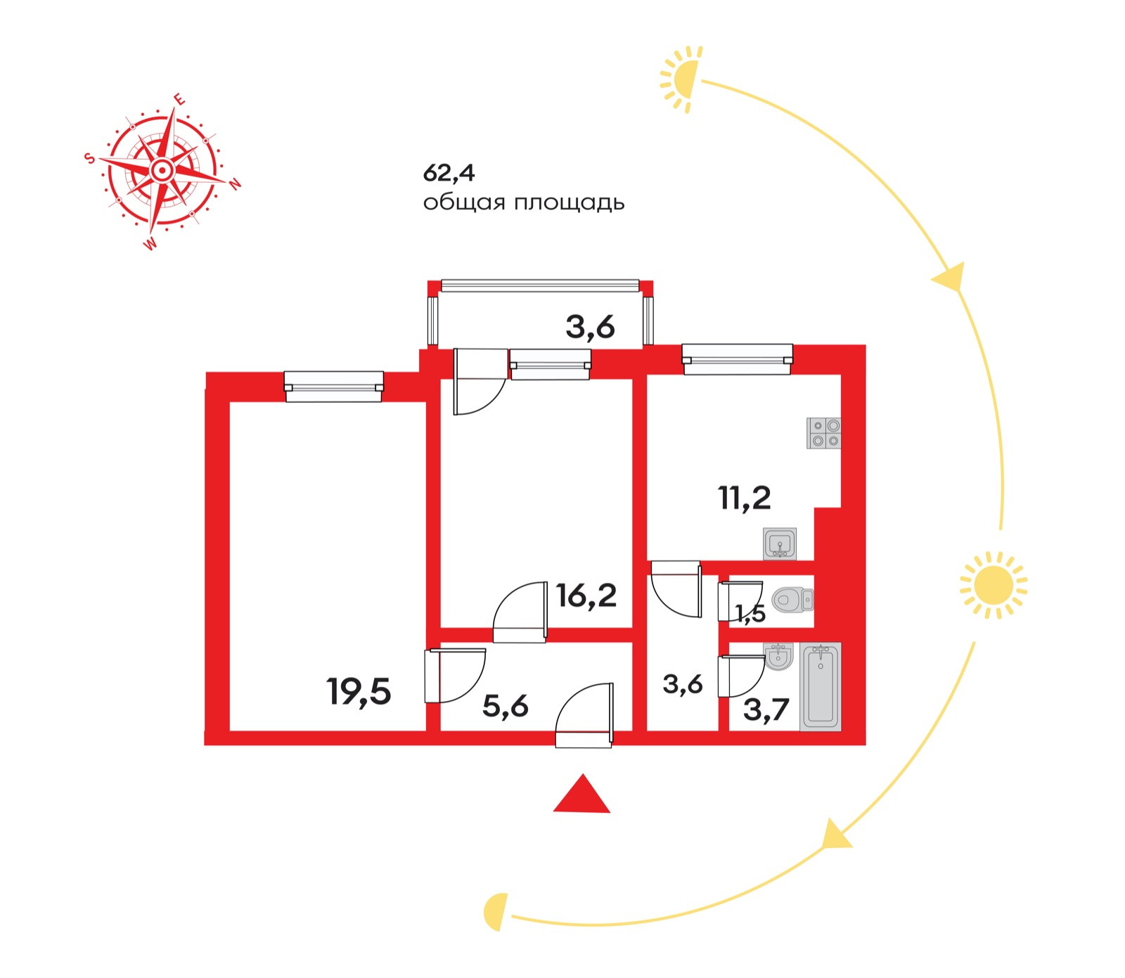 В ней: просторная кухня 11.2 кв.м., комнаты 16.2 и 19.5 кв.м.