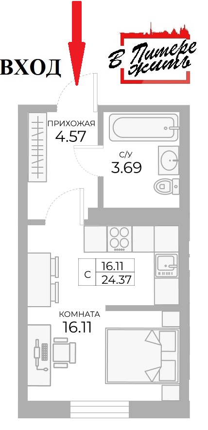 Общая площадь 24.2 м2