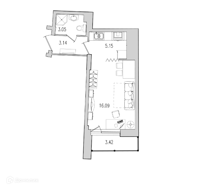 В планировке данной студии выделена зона кухни, что делает альтернативой однокомнатной квартире, но по более доступной цене.