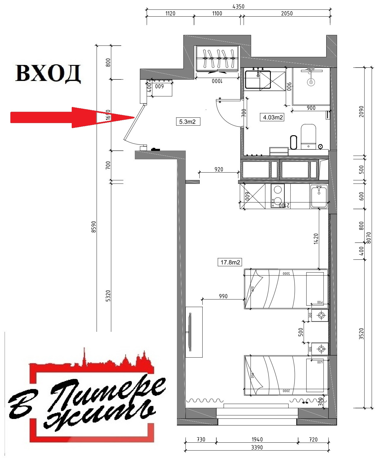 Площадь кухни 3 м2