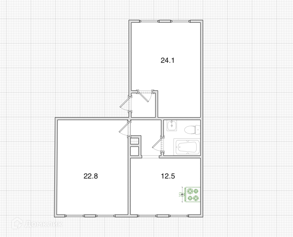 2 изолированные комнаты (22,8+24,1м2) с 2 окнами в каждой
