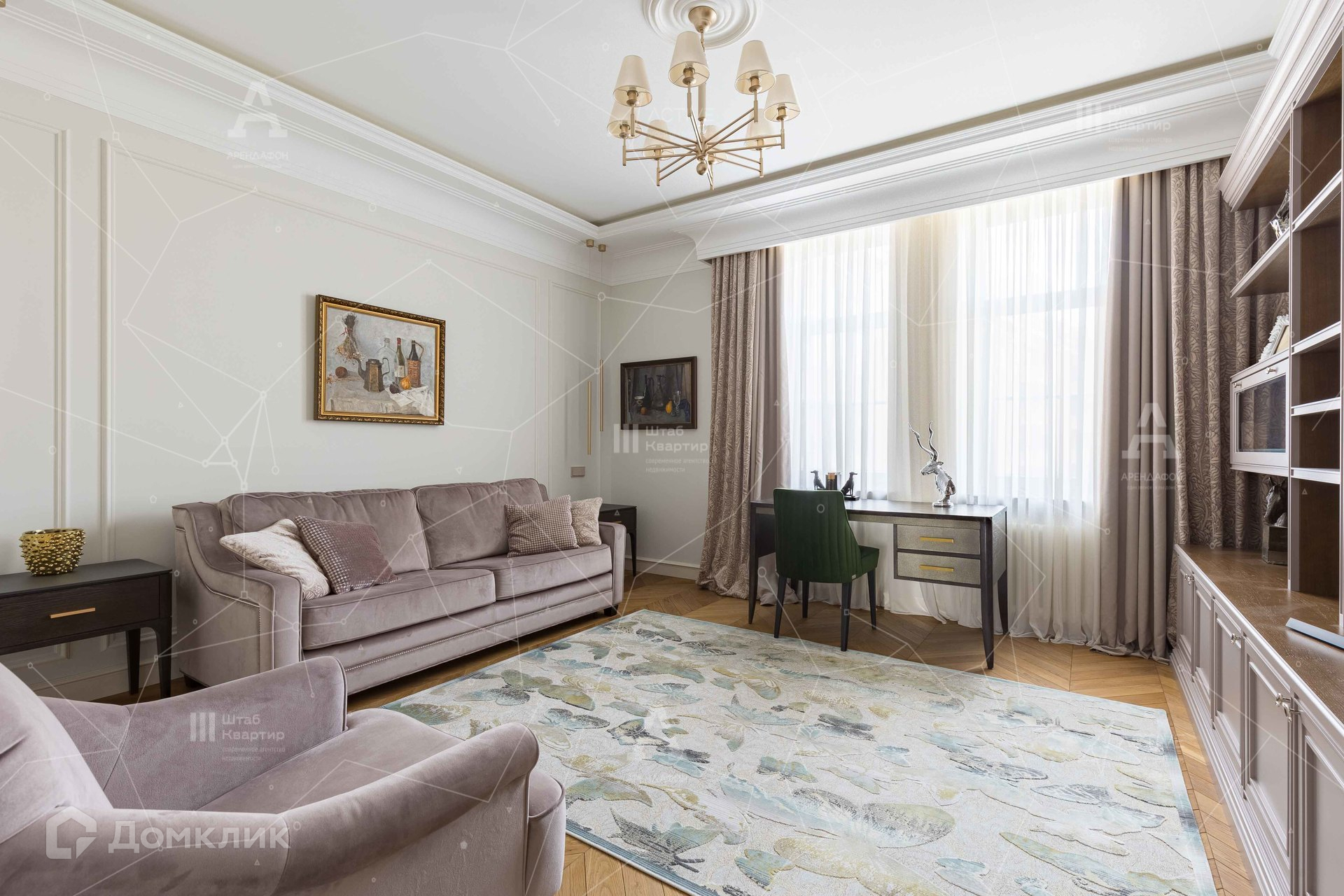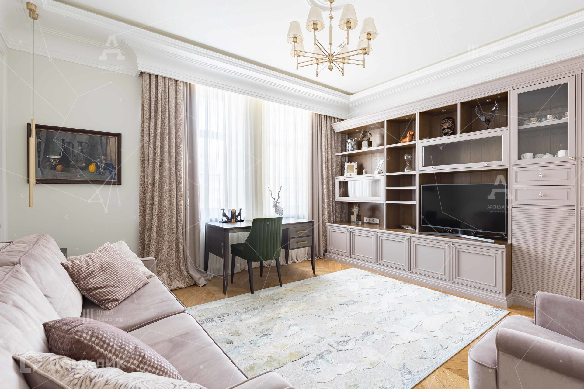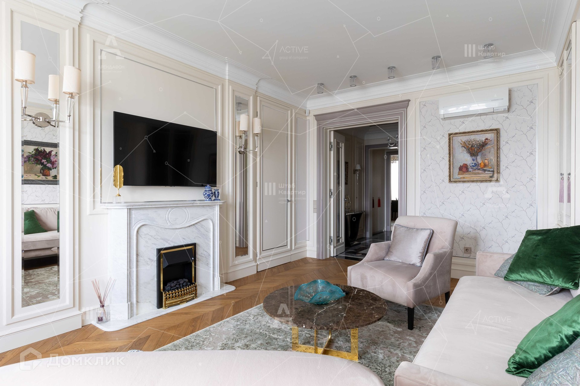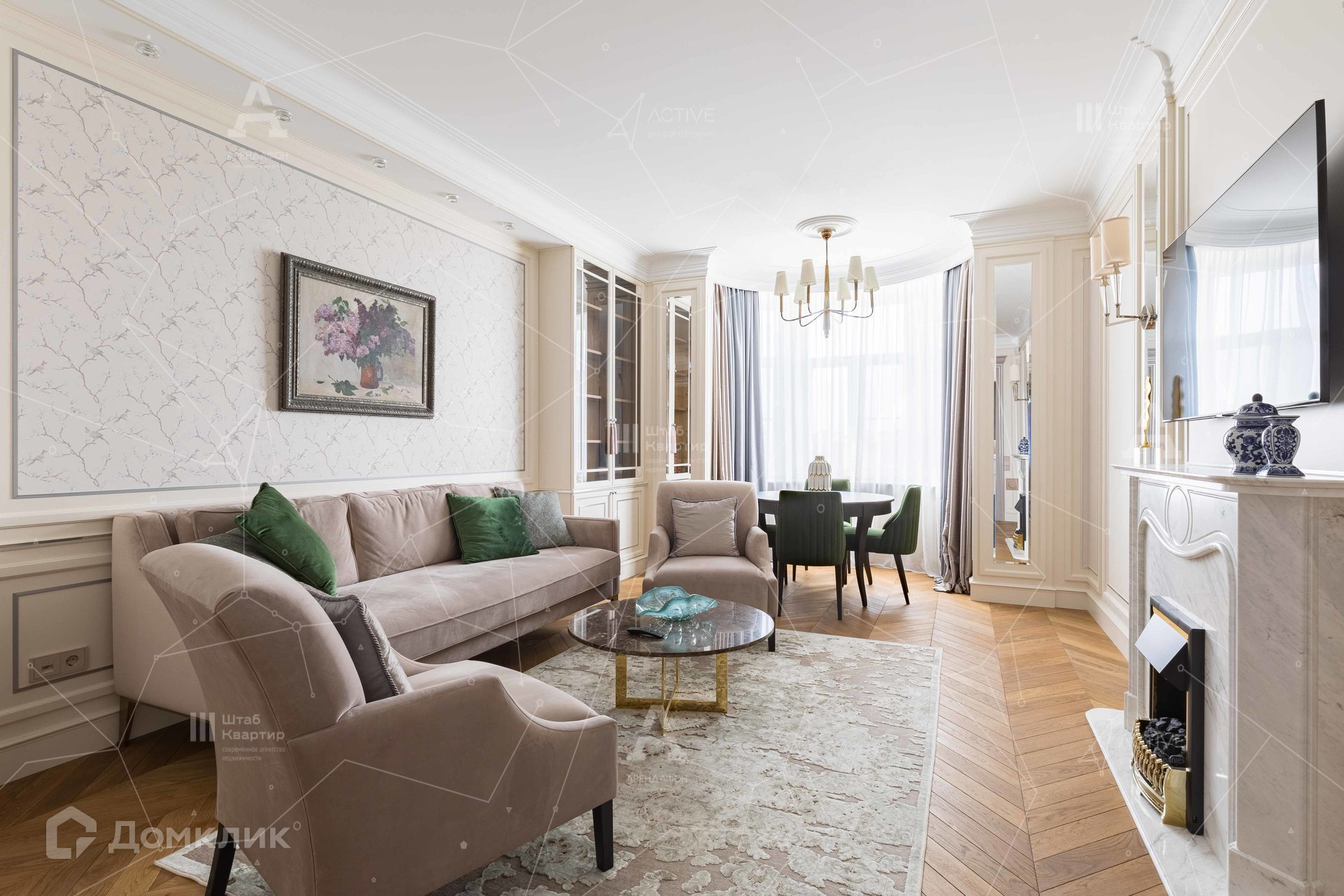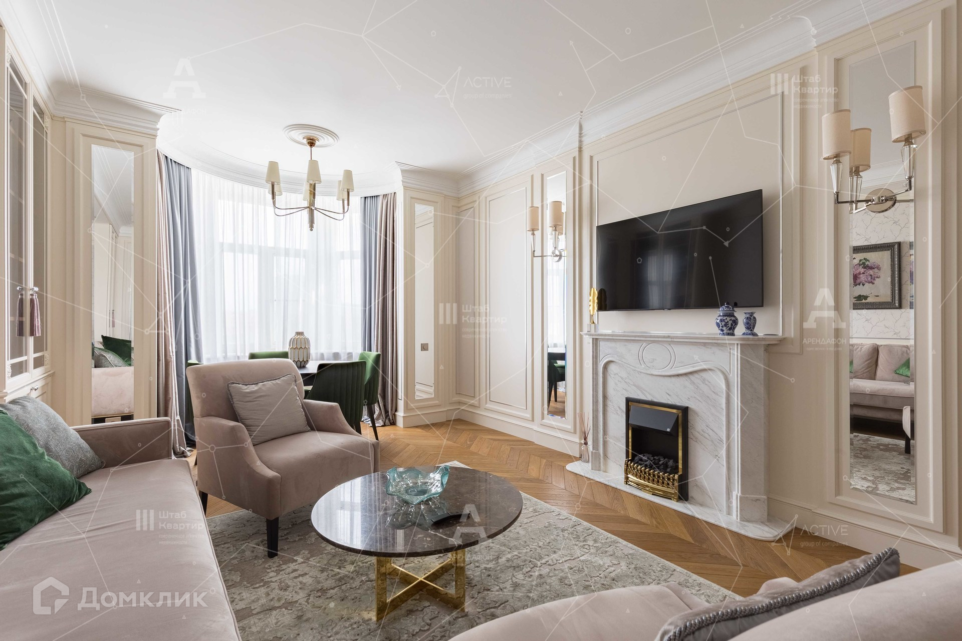 Интерьер выполнен в стиле неоклассики с аккуратными элементами ар-деко.