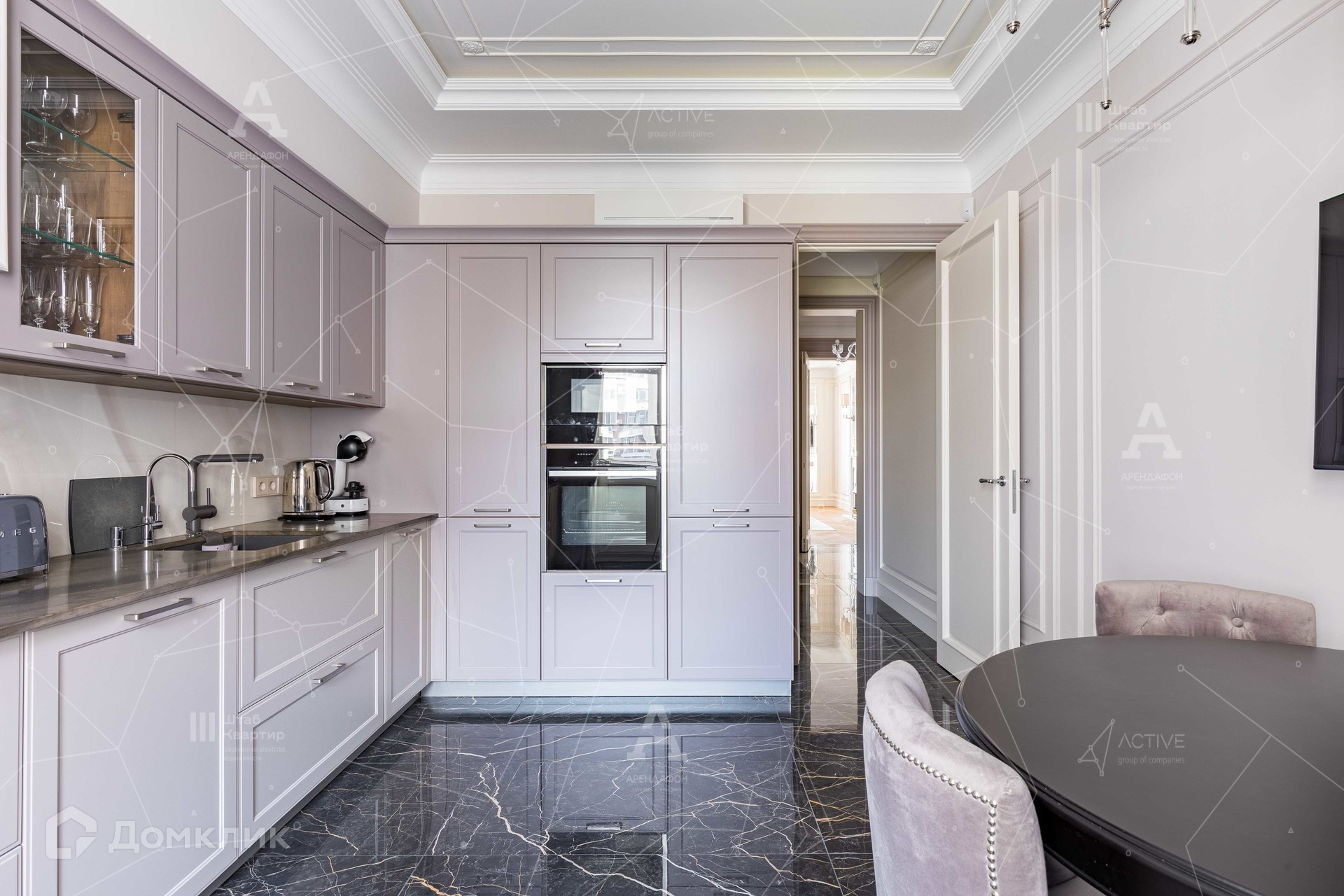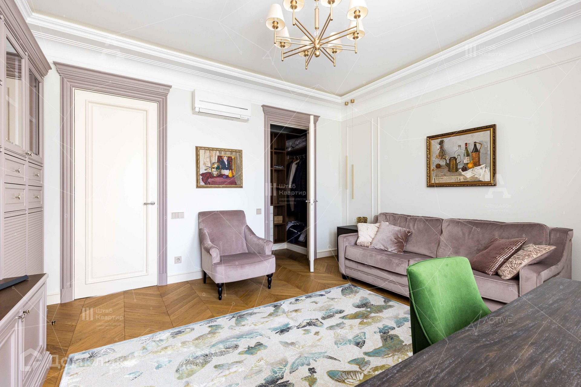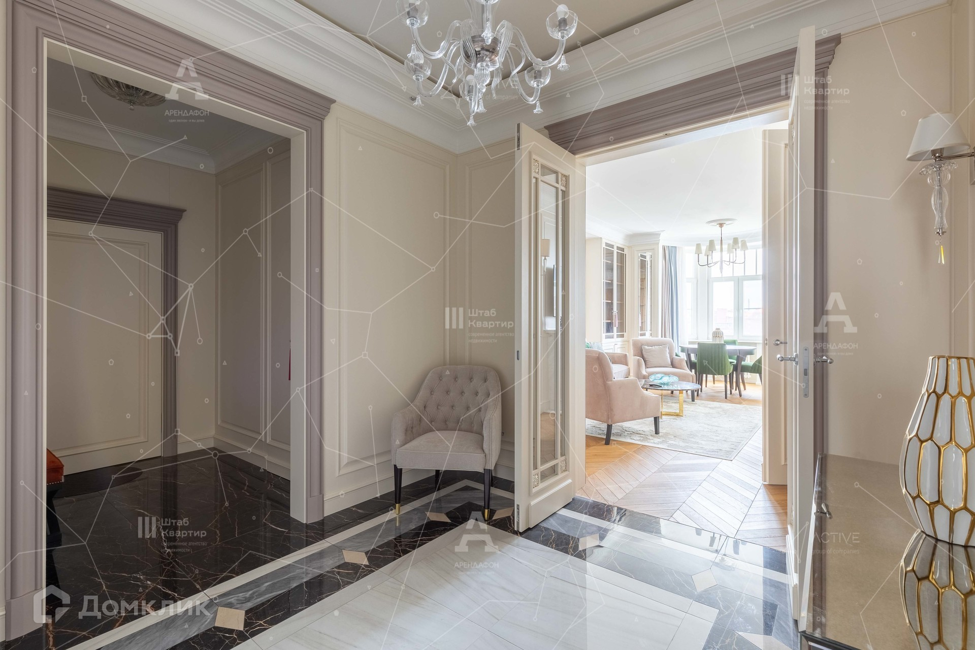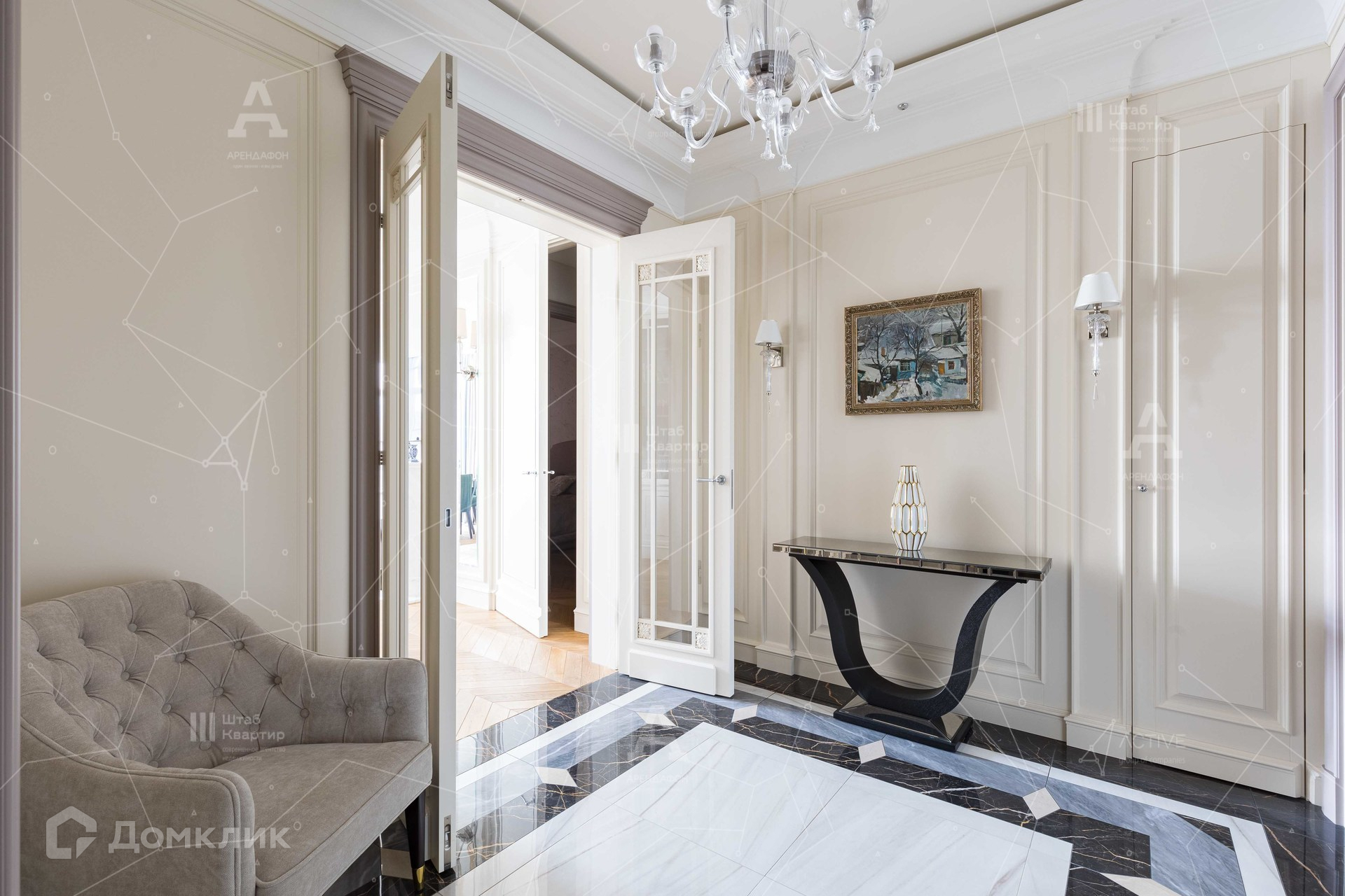 Интерьер выполнен в стиле неоклассики с аккуратными элементами ар-деко.