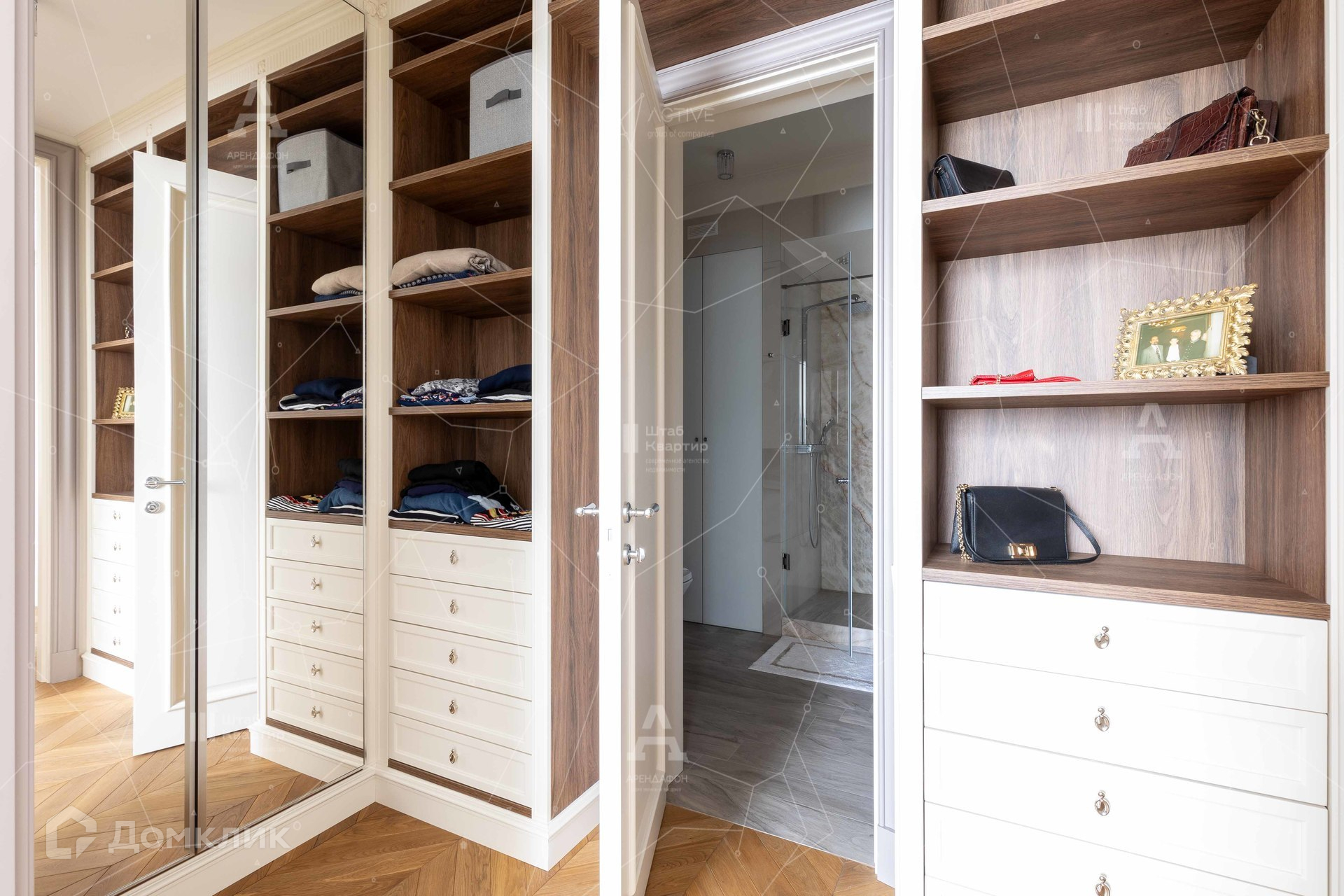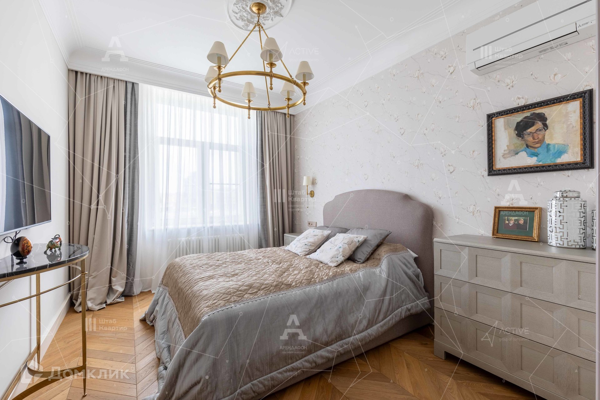 Спальня - единственная комната в квартире, которую можно было бы скромно назвать компактной, если бы не бонус в виде собственной комнатки хранения и входом в хозяйскую ванную.