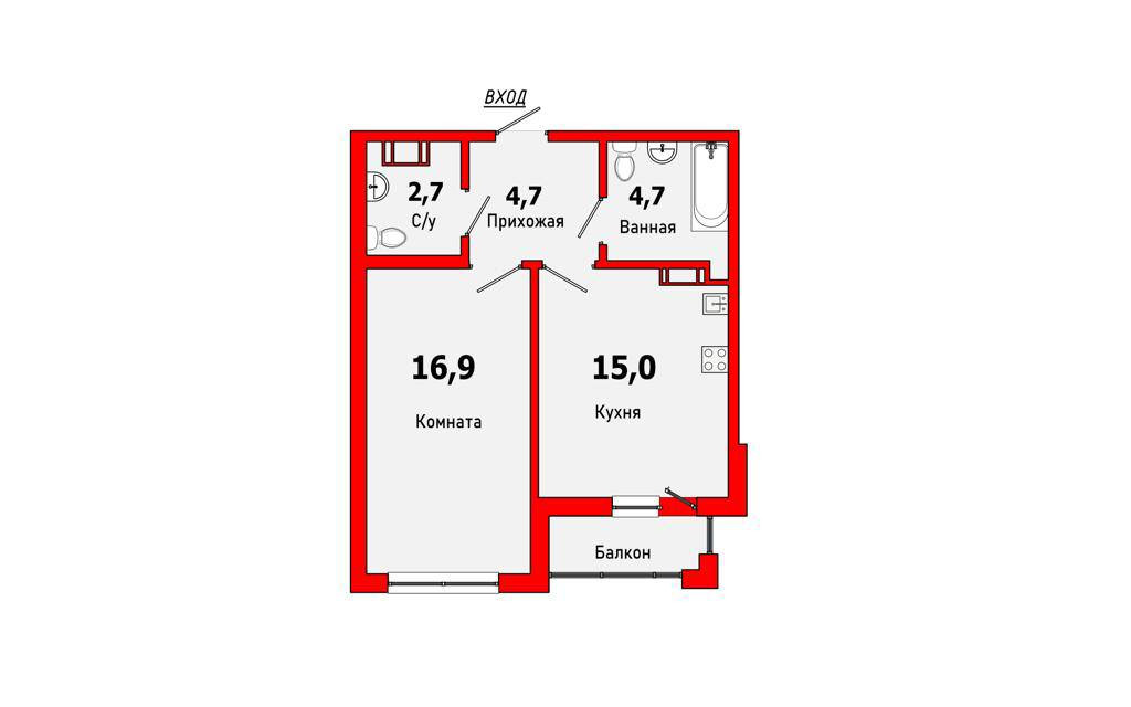 Общая площадь 43.3 м2