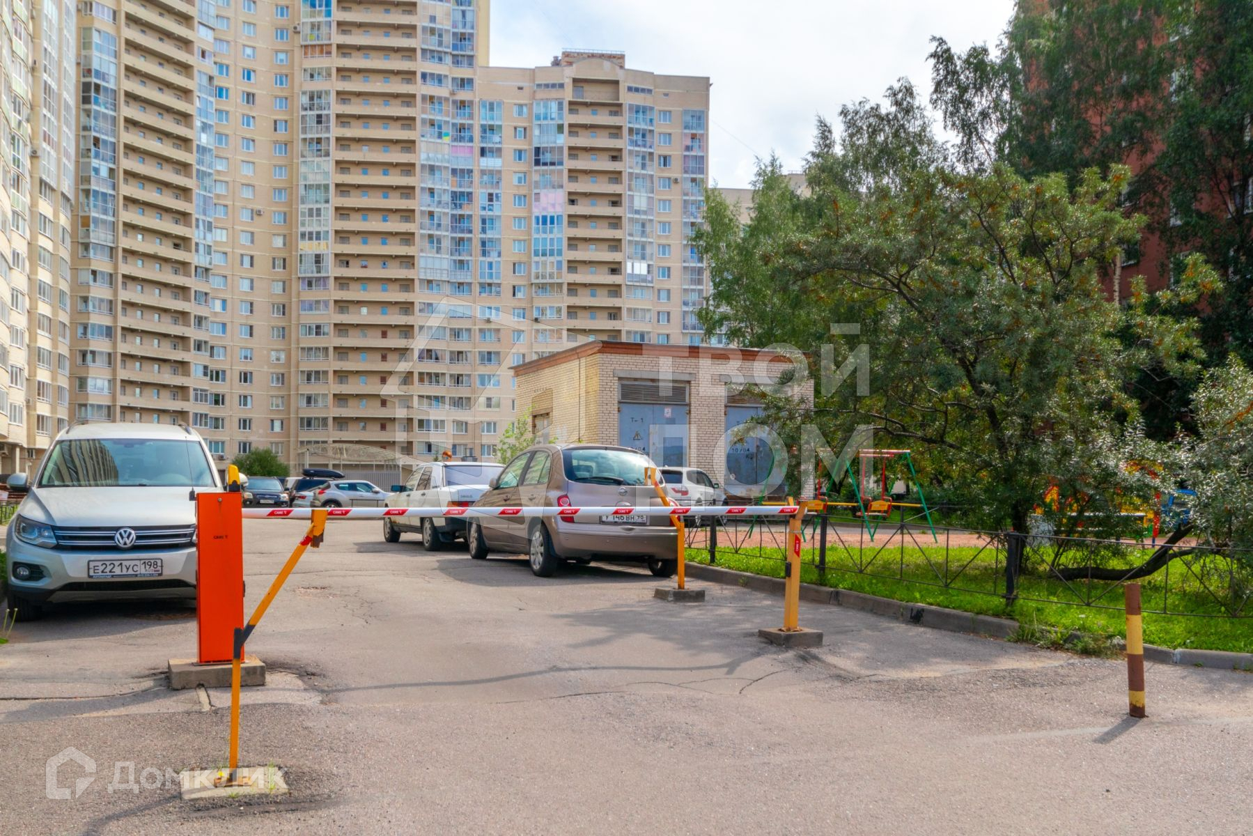 Закрытый, зеленый двор с детскими площадками.