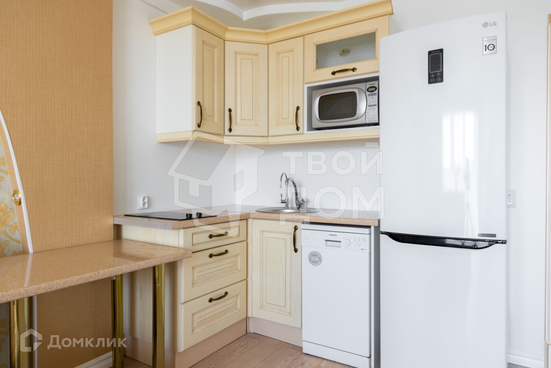 Кухонный гарнитур гармонично вписывается в интерьер и остаётся в подарок покупателю.