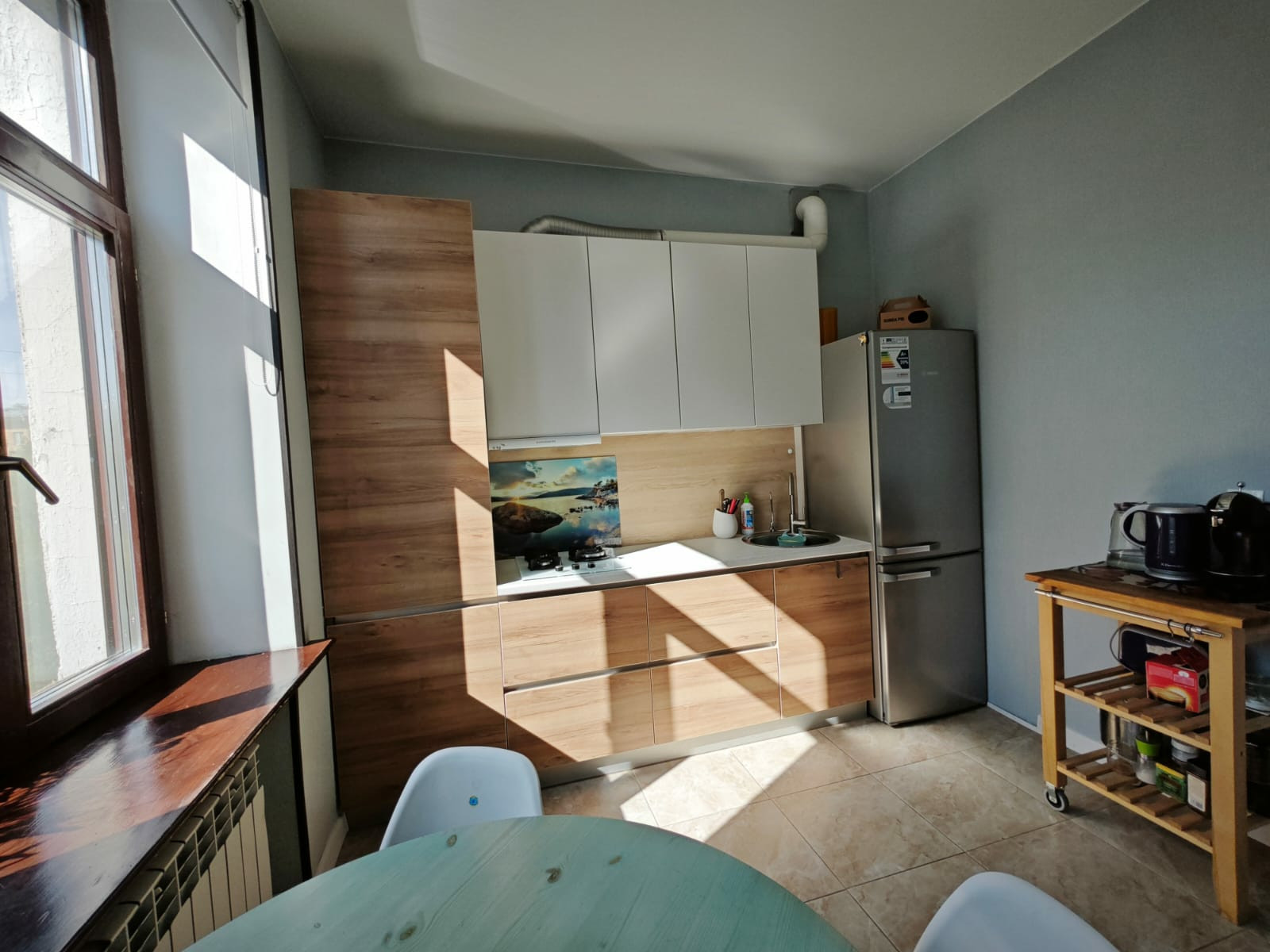 Новая дорогая кухня. Большая душевая кабина. Газовая колонка.