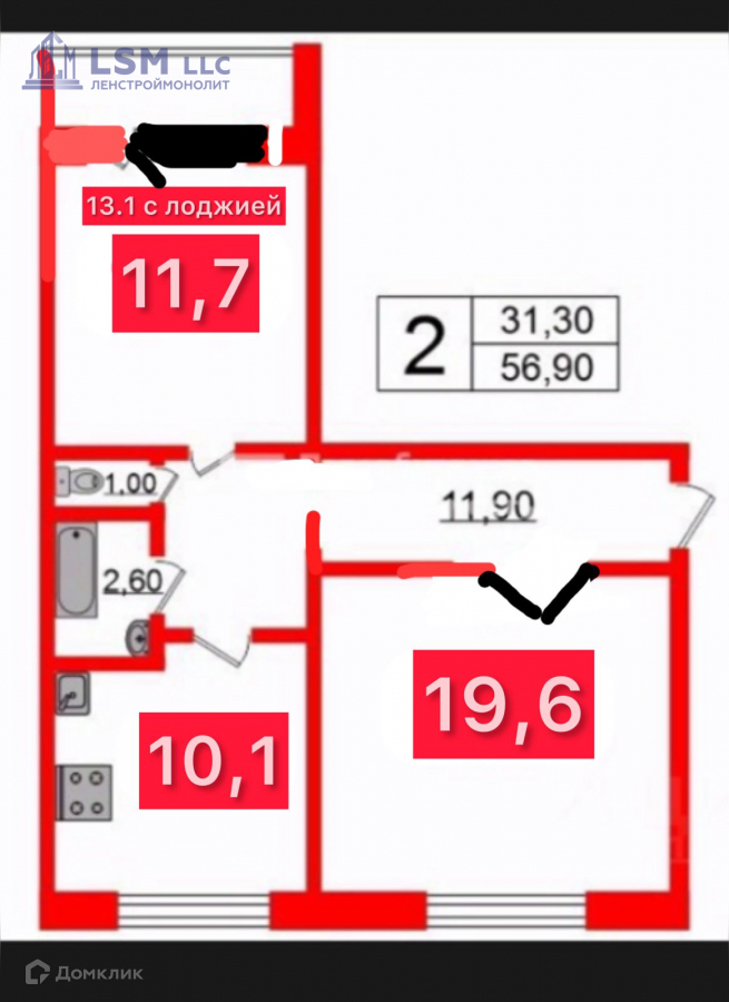 Общая площадь 56.9 м2