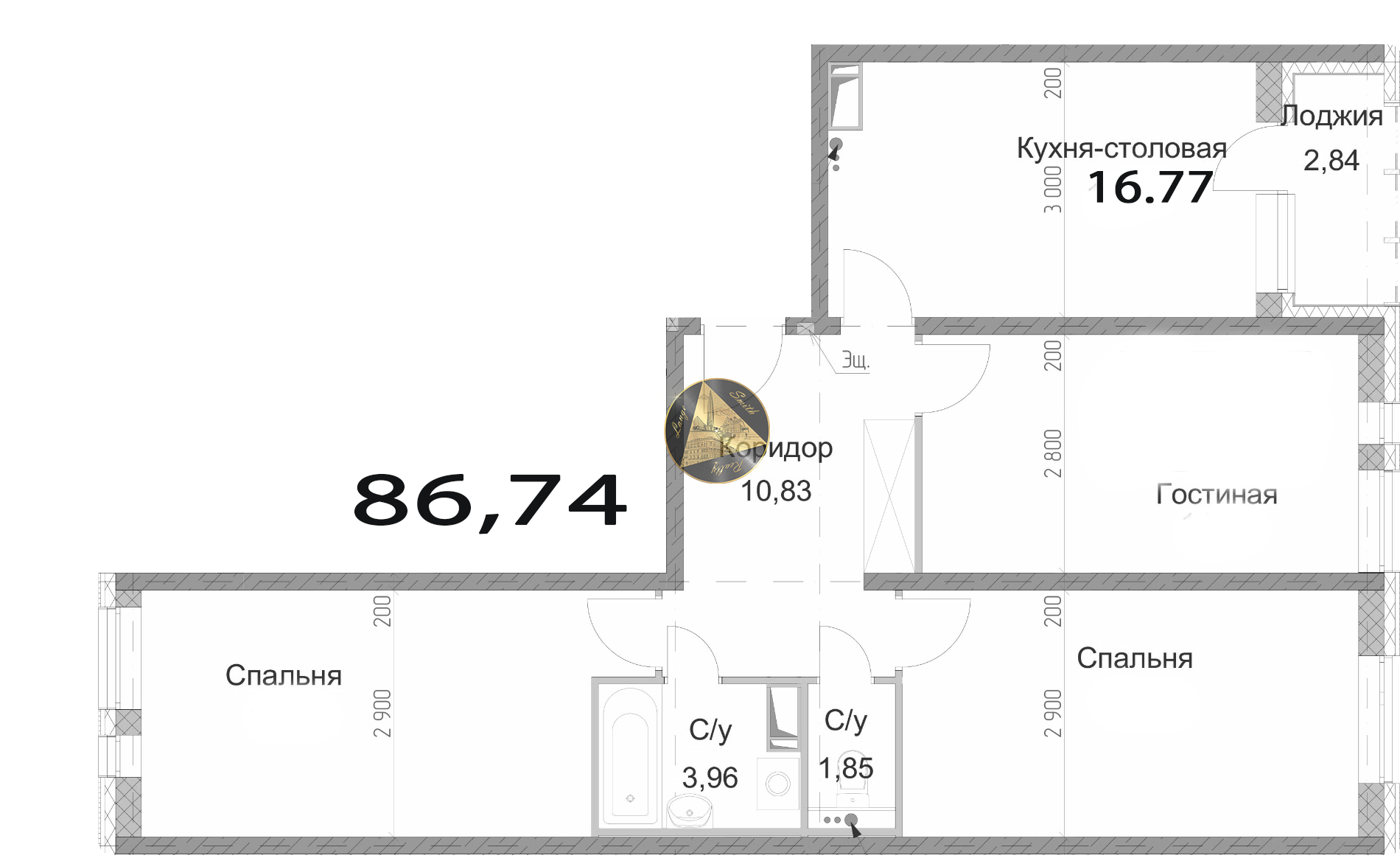 - Общая площадь квартиры 86,74 м2.
