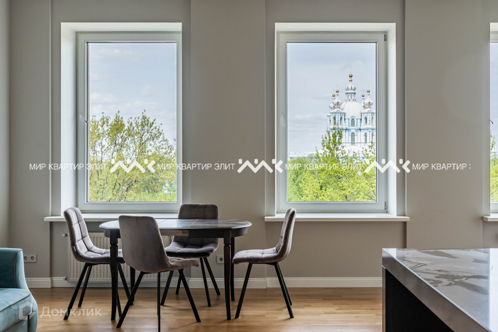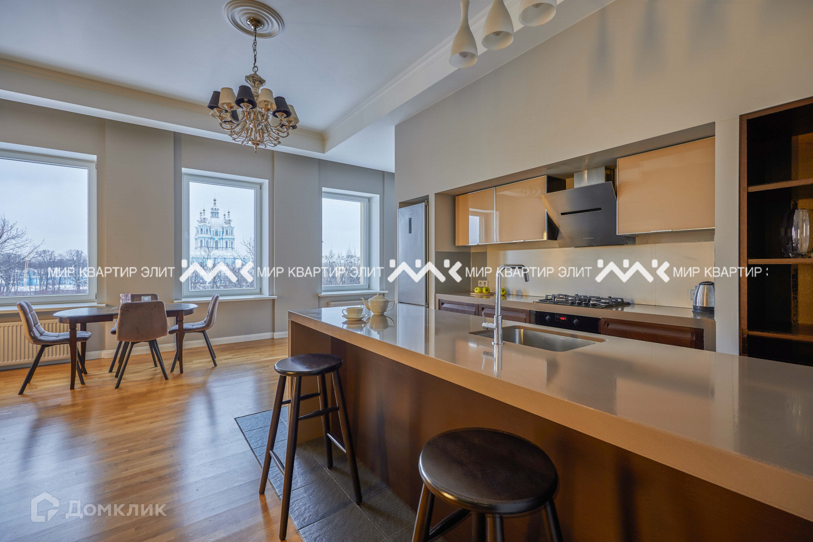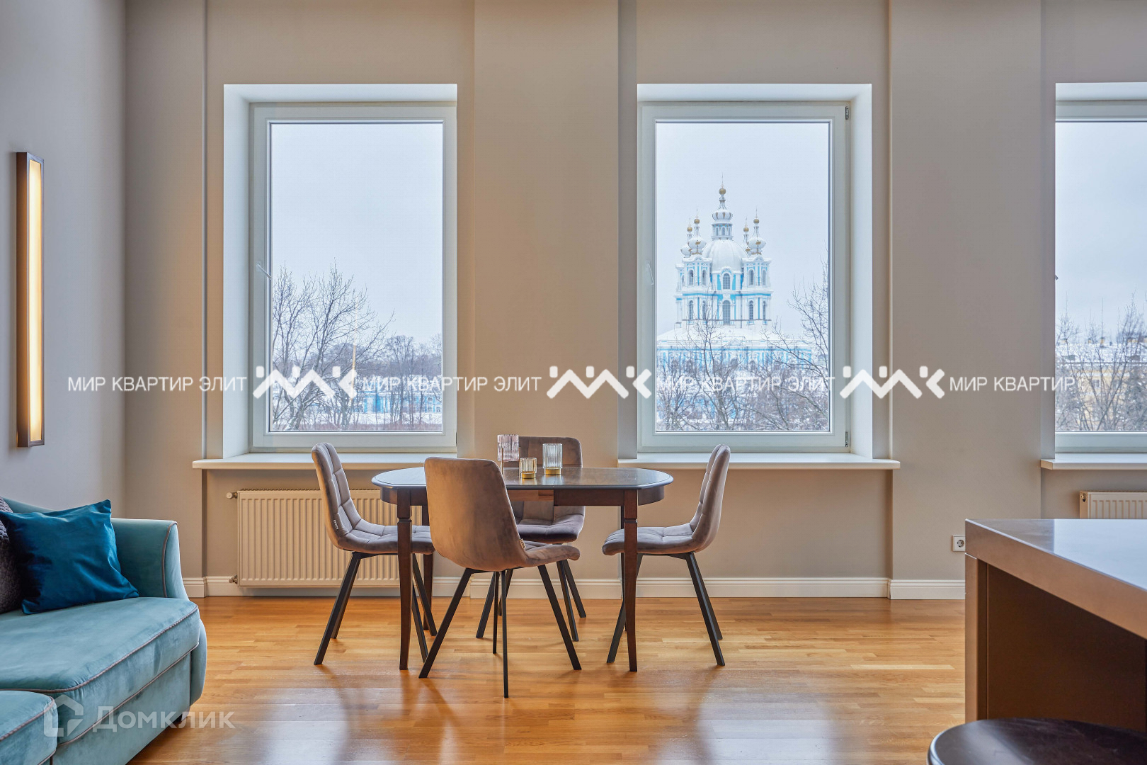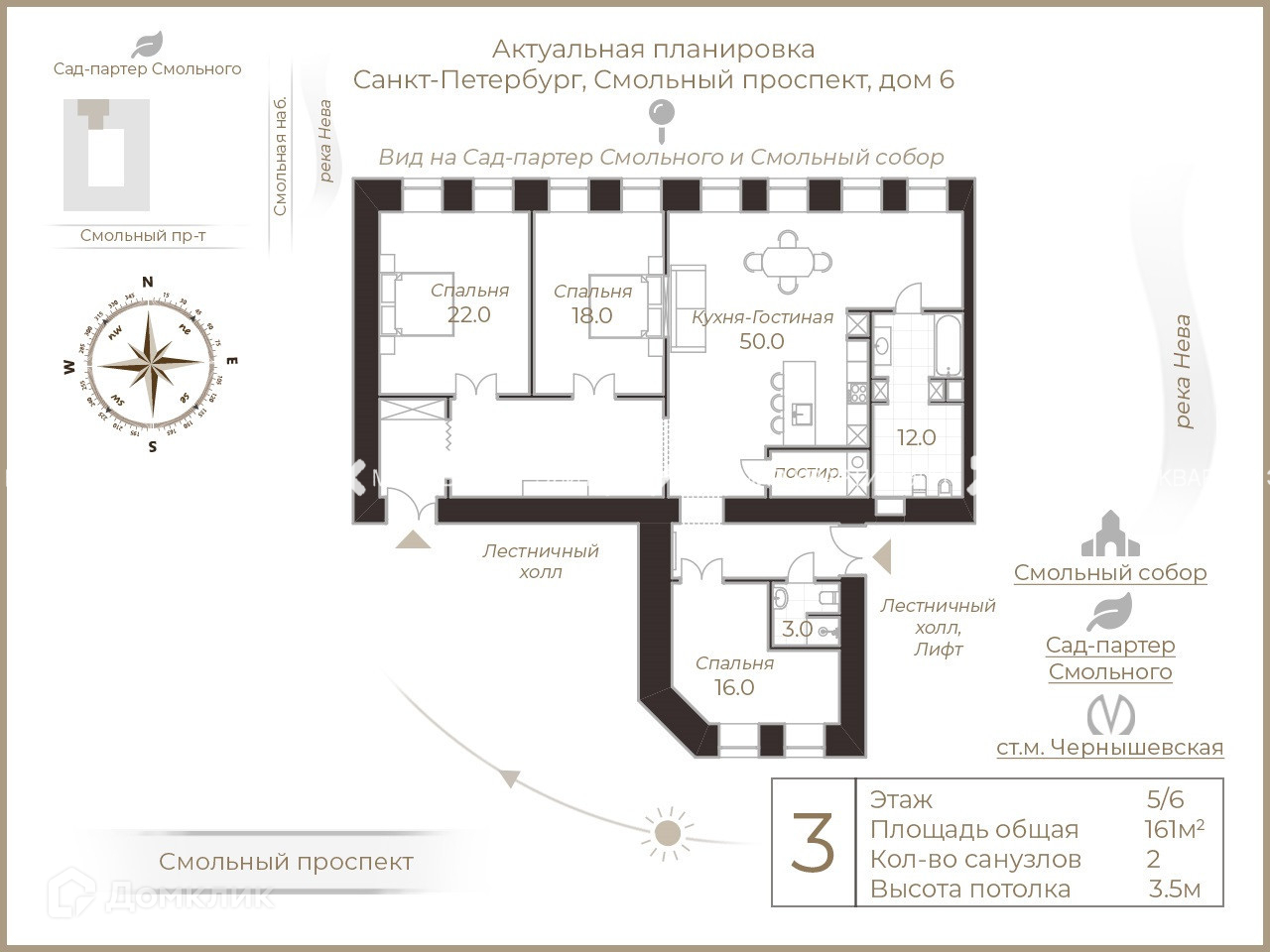 - площадь 161 м². Из кухни-гостиной (50 м²) и двух спален (22 и 18 м²) открывается вид на Смольный собор. В планировке предусмотрена третья уединенная спальня, где можно организовать рабочий кабинет или детскую, есть постирочная, два санузла;