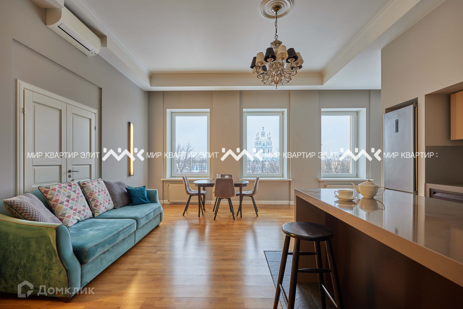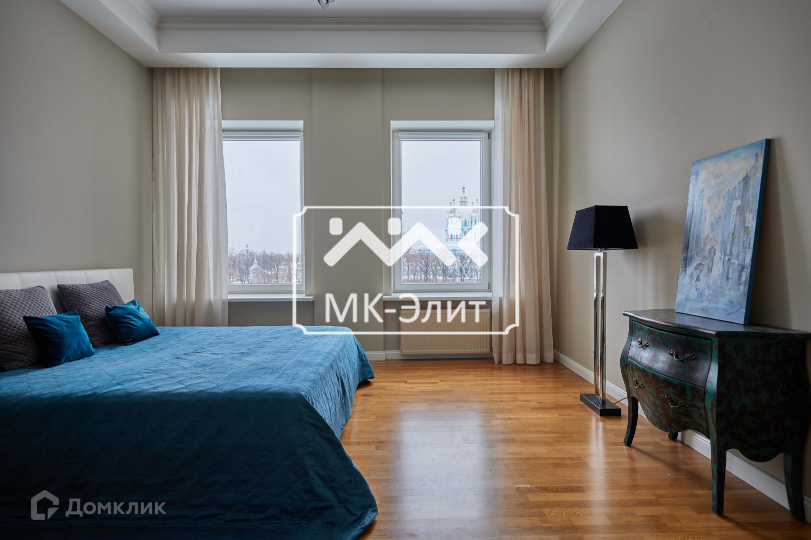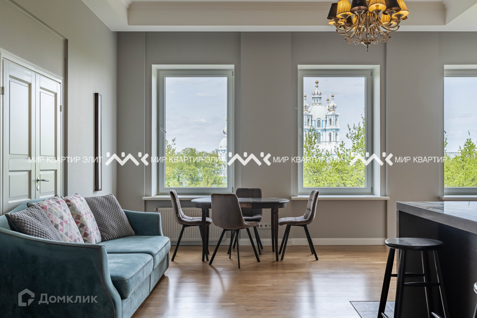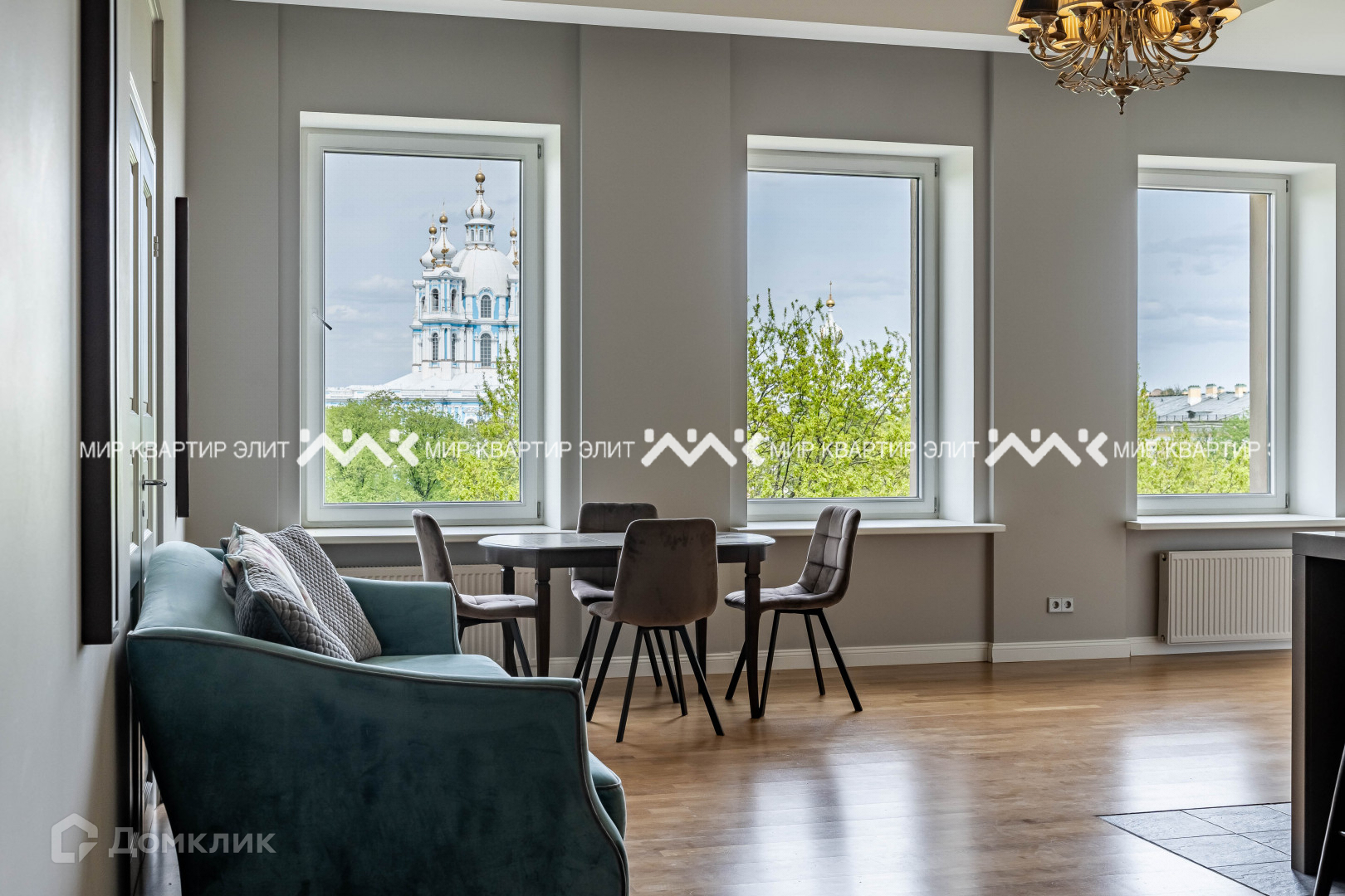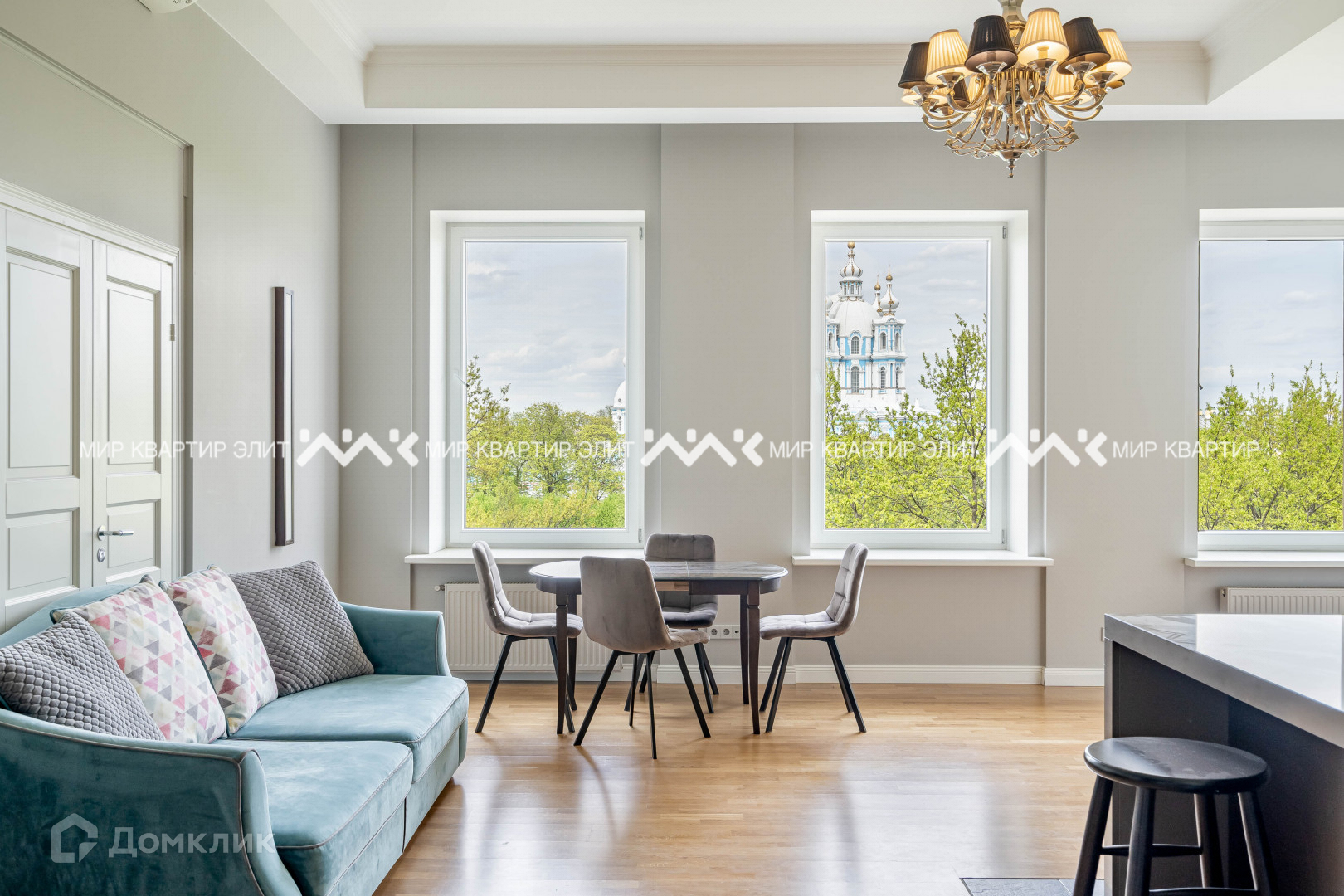 - площадь 161 м². Из кухни-гостиной (50 м²) и двух спален (22 и 18 м²) открывается вид на Смольный собор. В планировке предусмотрена третья уединенная спальня, где можно организовать рабочий кабинет или детскую, есть постирочная, два санузла;