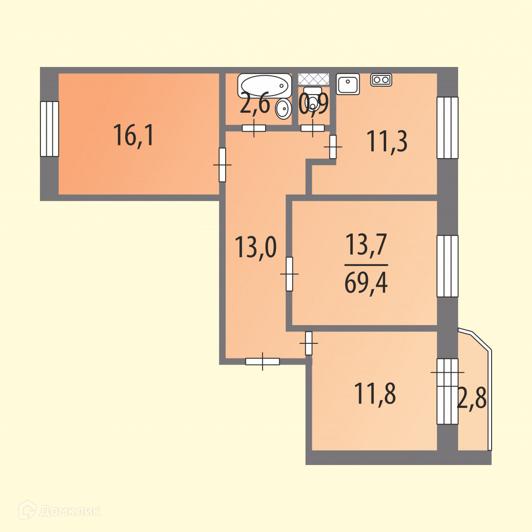 Общий метраж квартиры 69.4 м2, комнаты изолированные 16.1, 13, 7 и 11.8 м2, кухня 11.3 м2, прихожая 13 м2, застекленный балкон 2.8 м2. Высота - 2.7 м.