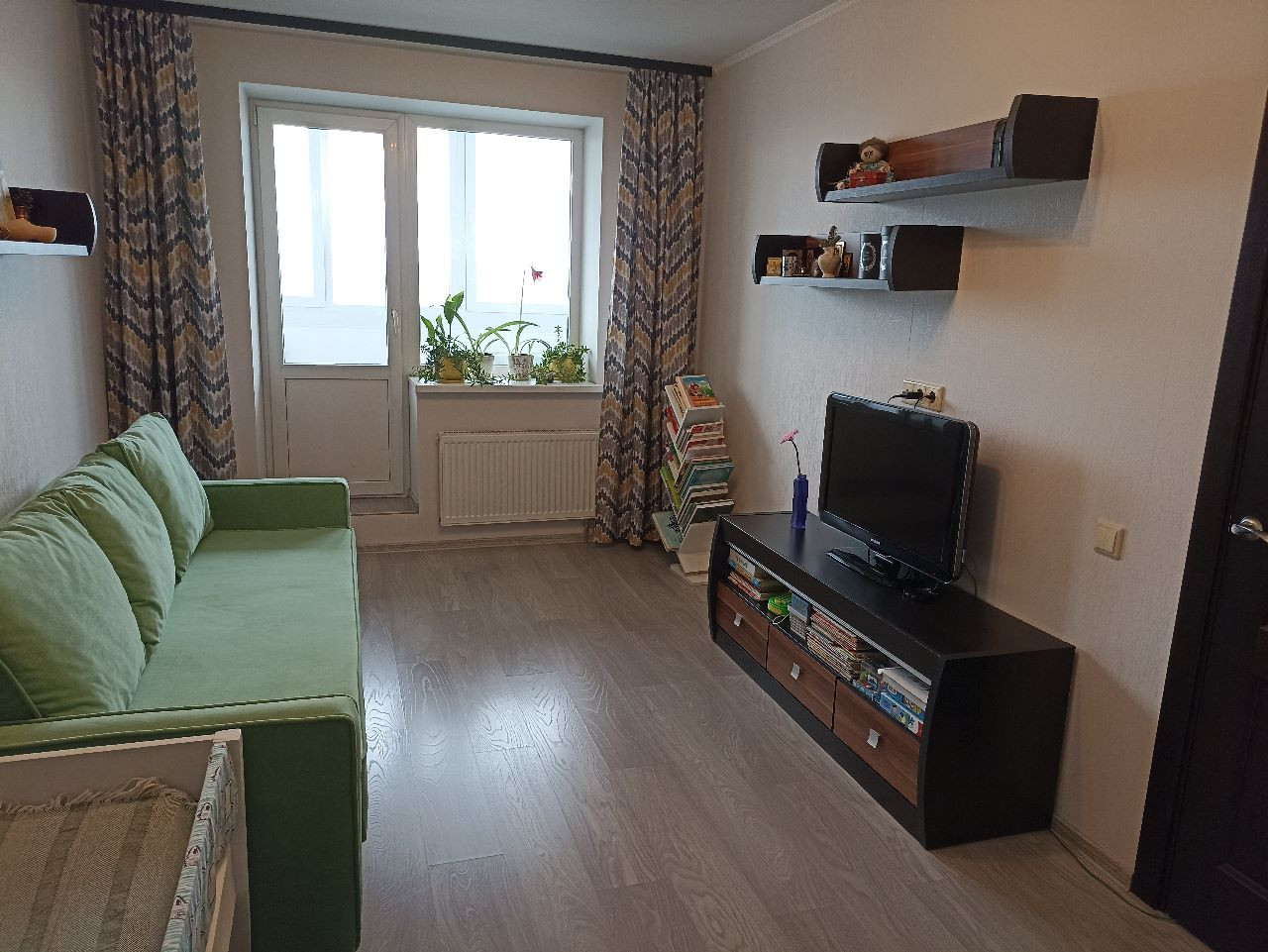 Повернув из прихожей налево, вы попадаете в светлую гостиную 16,3 кв. м. Здесь расположен качественный диван, который легко превращается в полноценную двуспальную кровать. Огромный шкаф во всю стену, в котором поместится все, что угодно, дабы не захламлять пространство. А что не поместилось в шкаф, можно убрать на закрытый балкон, где сделан качественный ремонт, уложена плитка, установлены стеклопакеты по всему периметру.