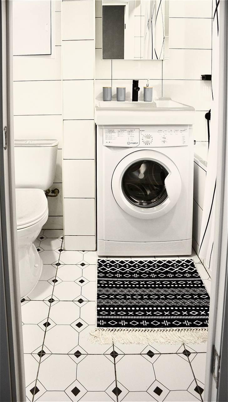 - В ванной установлена новая стиральная машина  зеркальный шкаф.