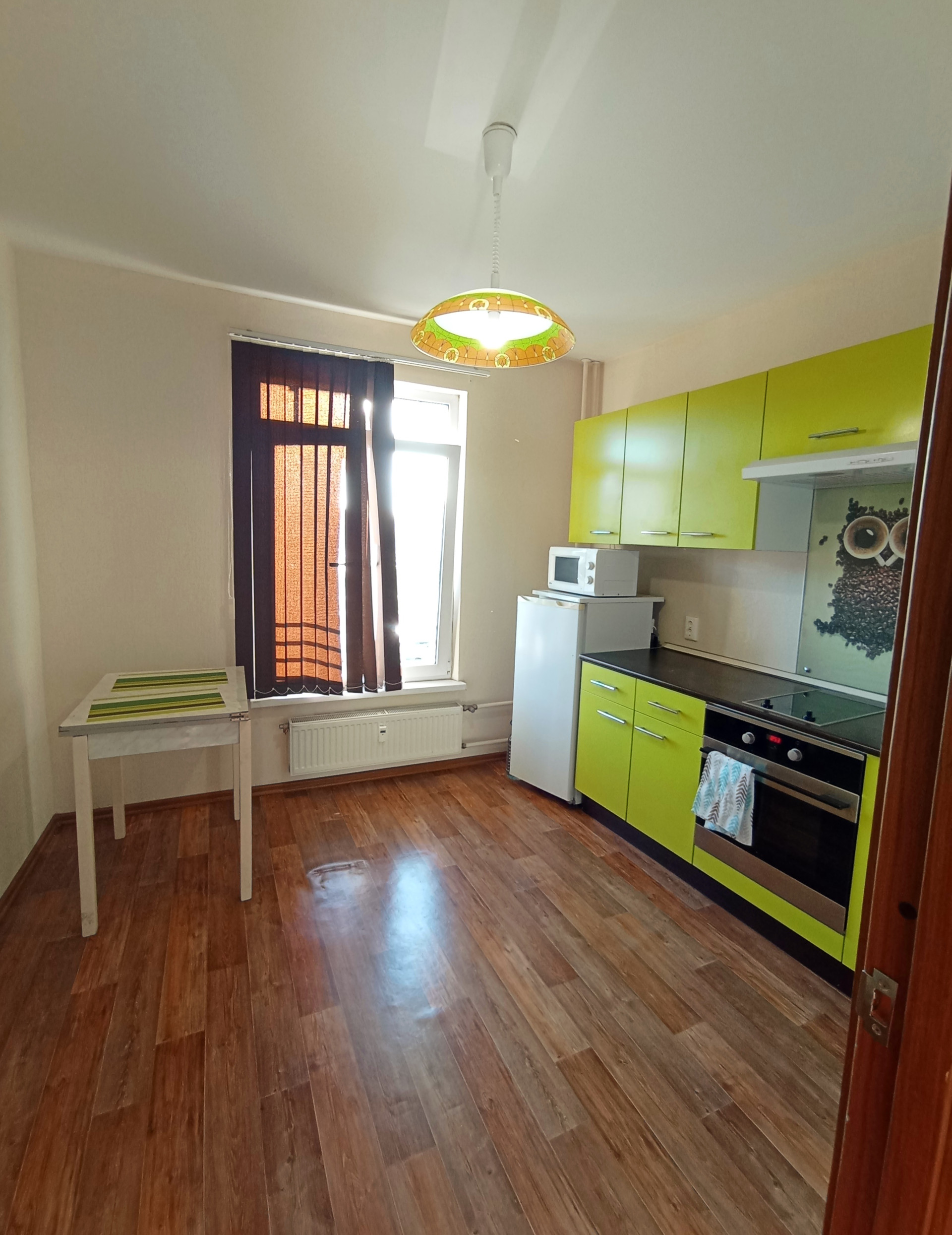 Общая площадь 36 кв.м.. Кухня 9 кв.м. Комната 18 кв.м. Окна выходят на Запад.Ремонт от застройщика. Кухня остается покупателю.                          Хорошее ТСЖ. Чистые подьезды. Закрытый двор со множеством рекреаций, детских площадок, тренажеров, скамеек и красивыми посадками. Совсем рядом парк и церковь Сятого Апостола Петра.
