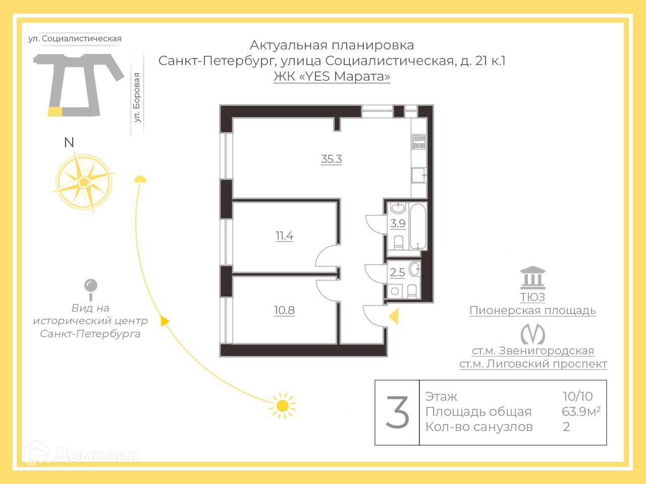 3-комнатная квартира, 63.9 м2, этаж 10 / 10, на продажу в Санкт-Петербурге, Социалистическая улица, 21