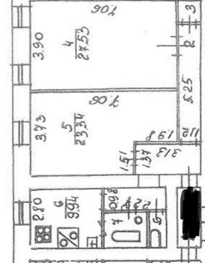 Общая площадь составляет 79,9 кв.м. Просторные комнаты 23,3 и 27 метров. В комнате большей площади выделана зона спальни. Большая кухня 10 метров.