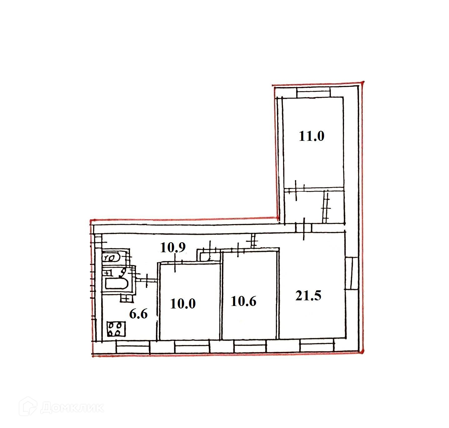 Изолированные комнаты 21.5+11+10.6 коридор 10.8 кв.м., кухня-гостинная 16.6 кв.м.