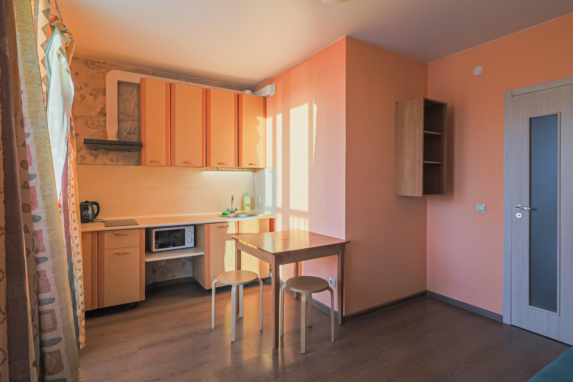 В квартире остаётся вся мебель и бытовая техника - кухонный гарнитур, керамическая варочная поверхность, СВ-печь, холодильник, стиральная машина, диван, шкаф.