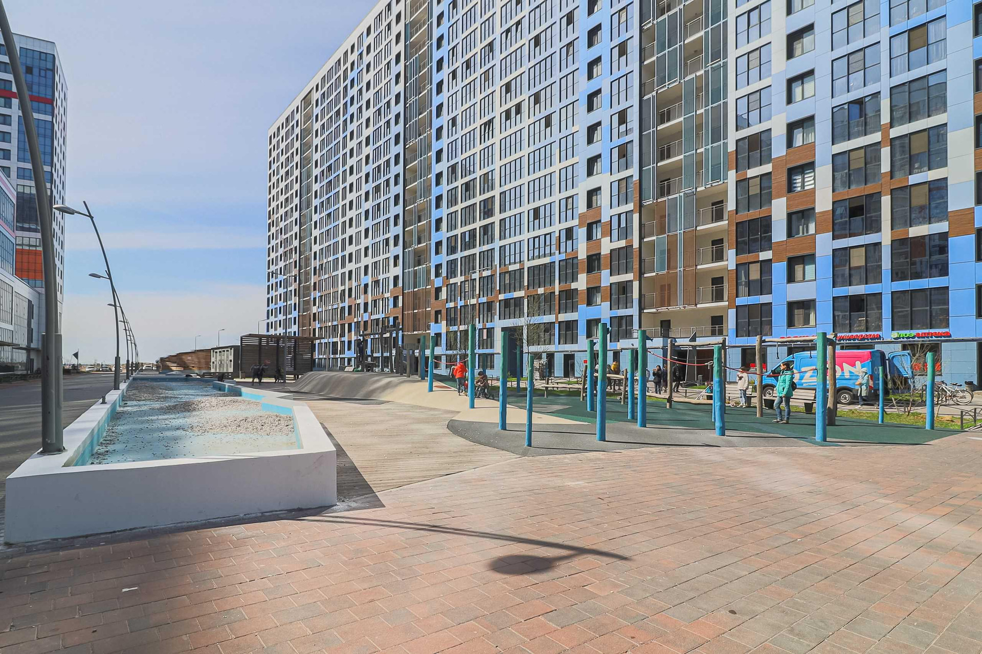 Во дворе современная детская и спортивная площадки. Двор закрытый (электрокары предоставляются бесплатно для перемещения во дворе), очень чистый и ухоженный с газонами, зелеными насаждениями и декоративным бассейном. Все необходимые магазины (аптеки, продуктовые и т.д.) в радиусе 200 м.