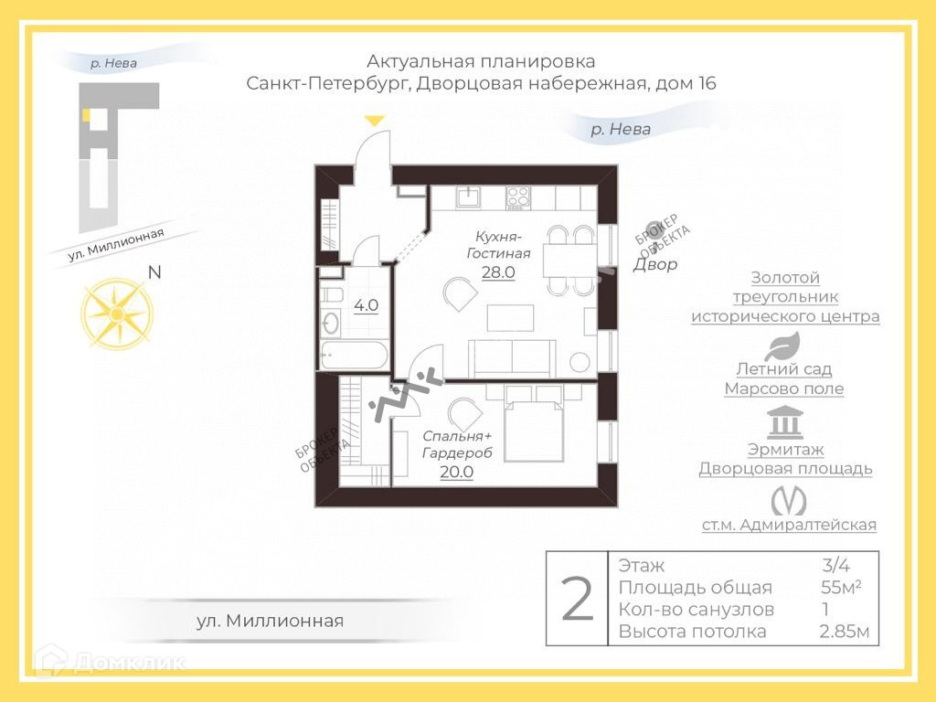 2-комнатная квартира, 55 м2, этаж 3 / 3, на продажу в Санкт-Петербурге, Дворцовая набережная, 16